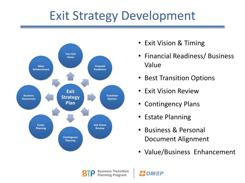 Exit Strategy Development • Exit Vision & Timing • Financial Readiness/ Business Value • Best Transition Options • Exit Vision Review • Contingency Plans • Estate Planning • Business & Personal Document Alignment • Value/Business Enhancement