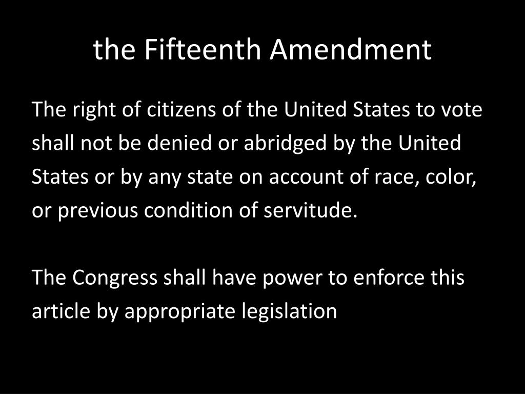 the Fifteenth Amendment The right of citizens of the United States to vote shall not be denied or abridged by the United States or by any state on account of race, color, or previous condition of servitude. The Congress shall have power to enforce this article by appropriate legislation