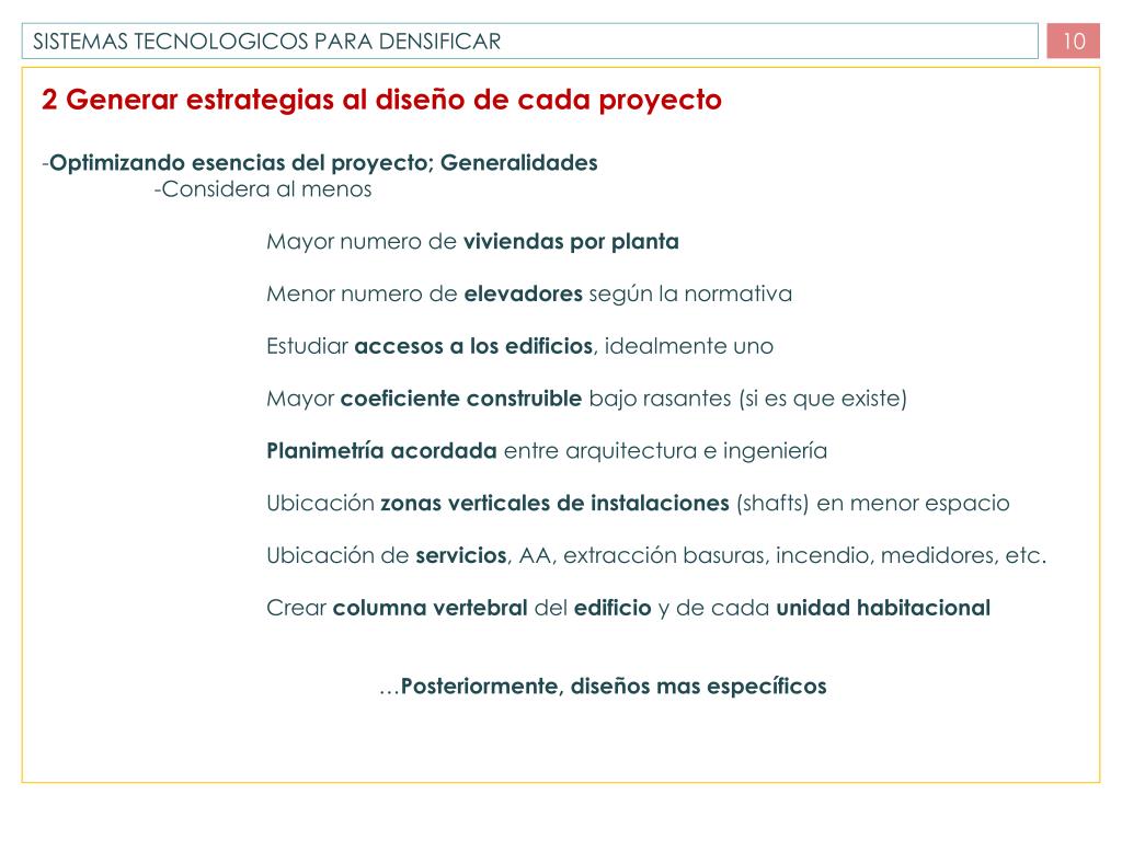 SISTEMAS TECNOLOGICOS PARA DENSIFICAR 9 2 Generar estrategias al diseño de cada proyecto -Planificar – Organizar – Direccionar – Controlar -Considera al menos Asignación de tareas y responsabilidades Elementos factibles a ser industrializados Evaluar los costos y las labores asociadas a la industrialización DIA- EIV Planificar mitigaciones de obra Anticipar eventos futuros y definir como enfrentarlos Cuadros de rendimiento de cada faena referido a los trabajadores Resolución de conflictos Manejo y reducción de riesgos en la construcción Decidir posibles subcontratos del proyecto Evaluacion consecutiva del desempeño