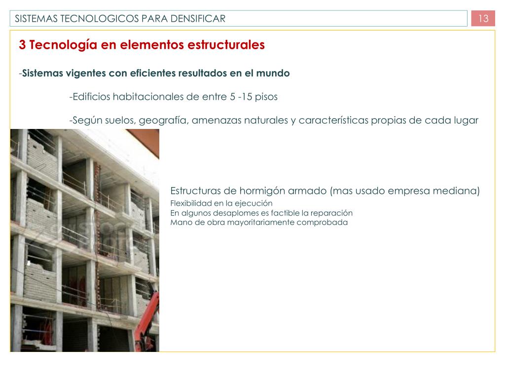 SISTEMAS TECNOLOGICOS PARA DENSIFICAR 12 3 Tecnología en elementos estructurales -Sistemas vigentes con eficientes resultados en el mundo -Edificios habitacionales de entre 5 -15 pisos -Según suelos, geografía, amenazas naturales y características propias de cada lugar Estructuras pilares y vigas acero en marcos rígidos (Uso común en EEUU) Bajo costo de mantenimiento Componentes reutilizables Desventajas: conductor del calor y corrosión