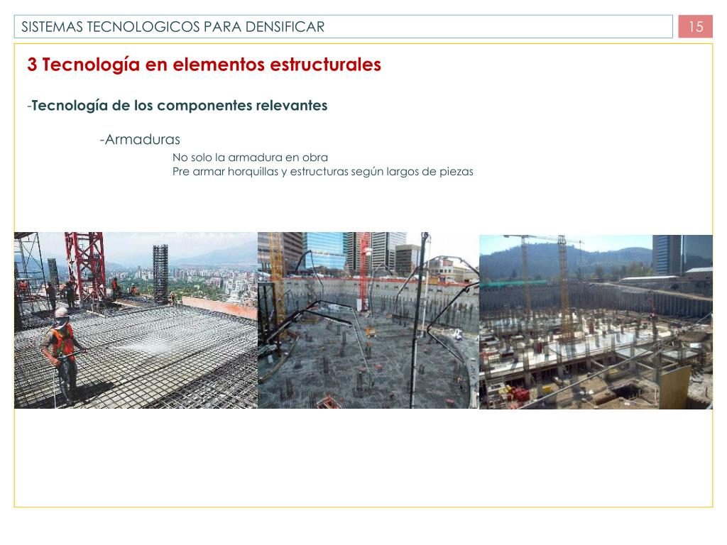 SISTEMAS TECNOLOGICOS PARA DENSIFICAR 15 3 Tecnología en elementos estructurales -Tecnología de los componentes relevantes -Armaduras No solo la armadura en obra Pre armar horquillas y estructuras según largos de piezas