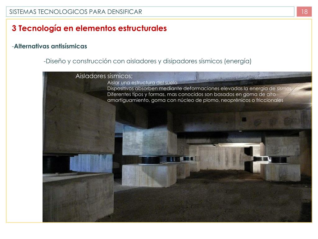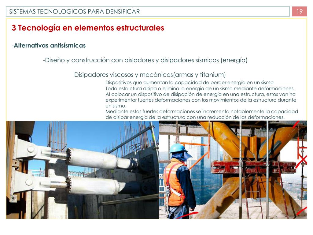 SISTEMAS TECNOLOGICOS PARA DENSIFICAR 18 3 Tecnología en elementos estructurales -Alternativas antisísmicas -Diseño y construcción con aisladores y disipadores sísmicos (energía) Aisladores sísmicos; Aislar una estructura del suelo Dispositivos absorben mediante deformaciones elevadas la energía de sismos Diferentes tipos y formas, mas conocidos son basados en goma de alto amortiguamiento, goma con núcleo de plomo, neoprénicos o friccionales