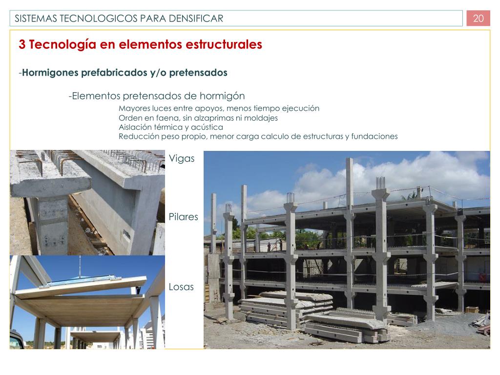 SISTEMAS TECNOLOGICOS PARA DENSIFICAR 20 3 Tecnología en elementos estructurales -Hormigones prefabricados y/o pretensados -Elementos pretensados de hormigón Mayores luces entre apoyos, menos tiempo ejecución Orden en faena, sin alzaprimas ni moldajes Aislación térmica y acústica Reducción peso propio, menor carga calculo de estructuras y fundaciones Vigas Pilares Losas