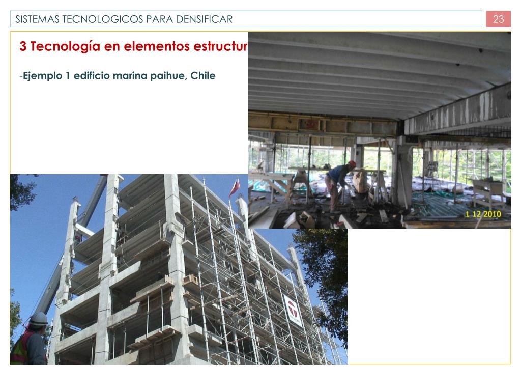 SISTEMAS TECNOLOGICOS PARA DENSIFICAR 22 3 Tecnología en elementos estructurales -Ejemplo 1 edificio marina paihue, Chile -Año construcción 2010 -3.200m2 en 9 pisos sobre aisladores sísmicos -Estructura de entrepisos -Marcos de HA Industrializado -12 aisladores y 6 deslizadores de energía -Reduce cerca de 5 veces los movimientos sísmicos