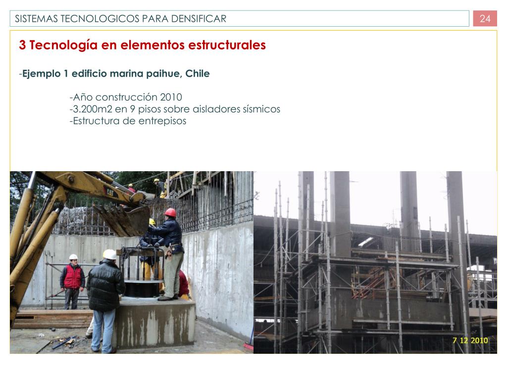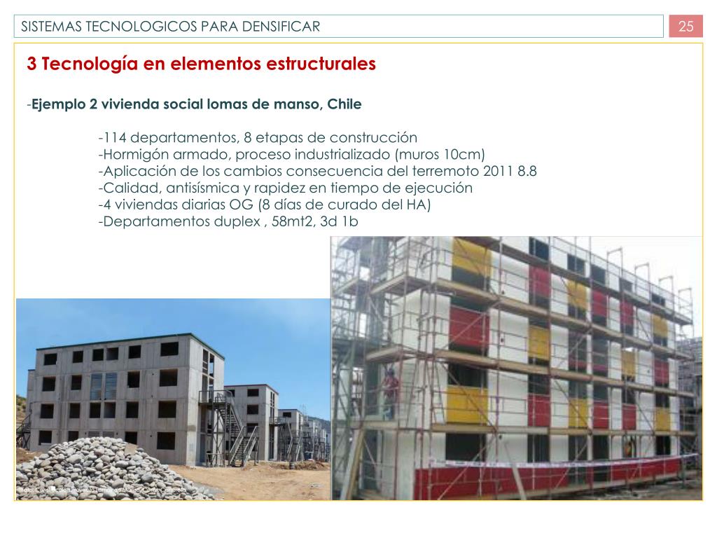 SISTEMAS TECNOLOGICOS PARA DENSIFICAR 24 3 Tecnología en elementos estructurales -Ejemplo 1 edificio marina paihue, Chile -Año construcción 2010 -3.200m2 en 9 pisos sobre aisladores sísmicos -Estructura de entrepisos