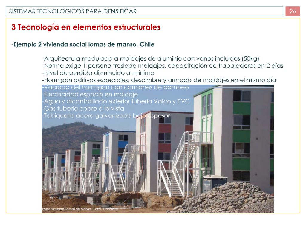 SISTEMAS TECNOLOGICOS PARA DENSIFICAR 25 3 Tecnología en elementos estructurales -Ejemplo 2 vivienda social lomas de manso, Chile -114 departamentos, 8 etapas de construcción -Hormigón armado, proceso industrializado (muros 10cm) -Aplicación de los cambios consecuencia del terremoto 2011 8.8 -Calidad, antisísmica y rapidez en tiempo de ejecución -4 viviendas diarias OG (8 días de curado del HA) -Departamentos duplex , 58mt2, 3d 1b