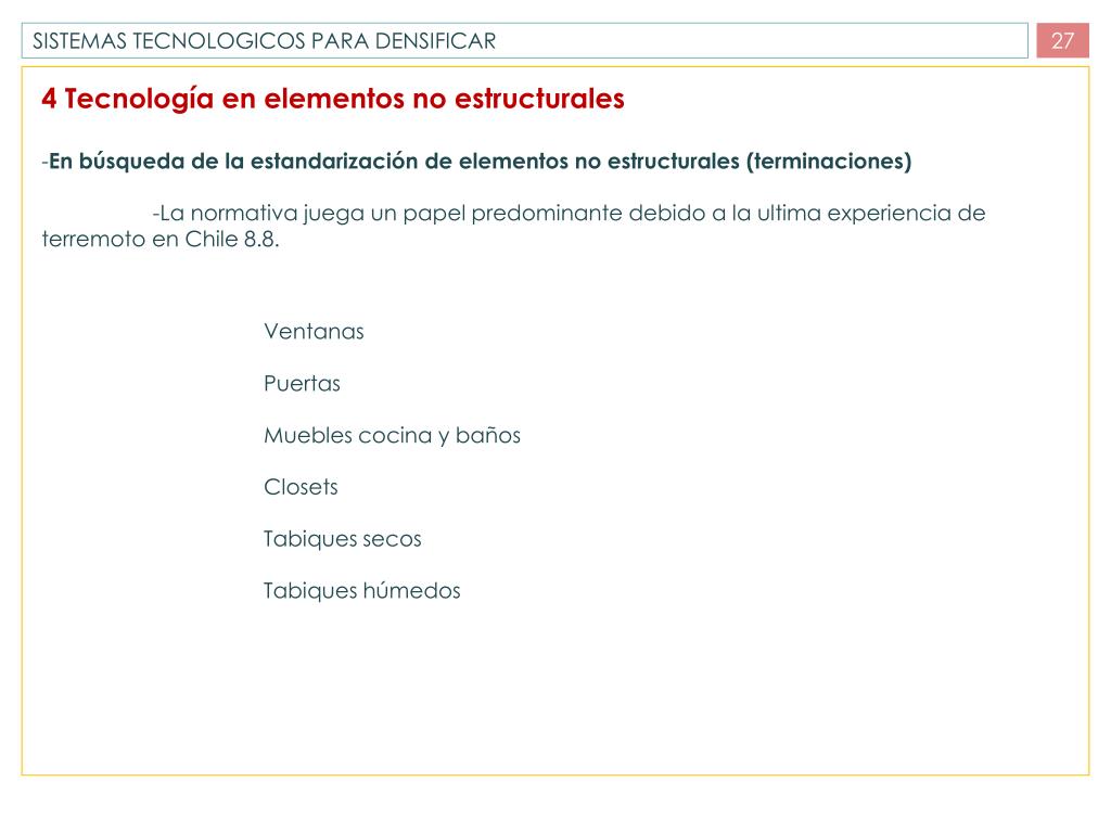 SISTEMAS TECNOLOGICOS PARA DENSIFICAR 27 4 Tecnología en elementos no estructurales -En búsqueda de la estandarización de elementos no estructurales (terminaciones) -La normativa juega un papel predominante debido a la ultima experiencia de terremoto en Chile 8.8. Ventanas Puertas Muebles cocina y baños Closets Tabiques secos Tabiques húmedos