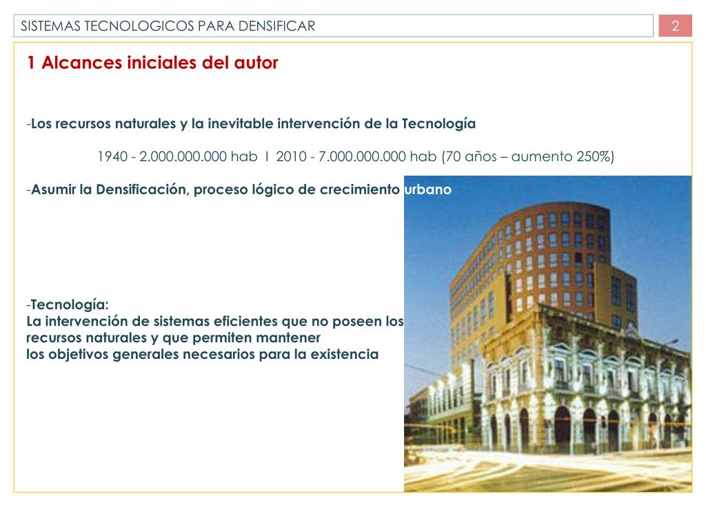 SISTEMAS TECNOLOGICOS PARA DENSIFICAR 2 1 Alcances iniciales del autor -Los recursos naturales y la inevitable intervención de la Tecnología 1940 - 2.000.000.000 hab I 2010 - 7.000.000.000 hab (70 años – aumento 250%) -Asumir la Densificación, proceso lógico de crecimiento urbano -Tecnología: La intervención de sistemas eficientes que no poseen los recursos naturales y que permiten mantener los objetivos generales necesarios para la existencia