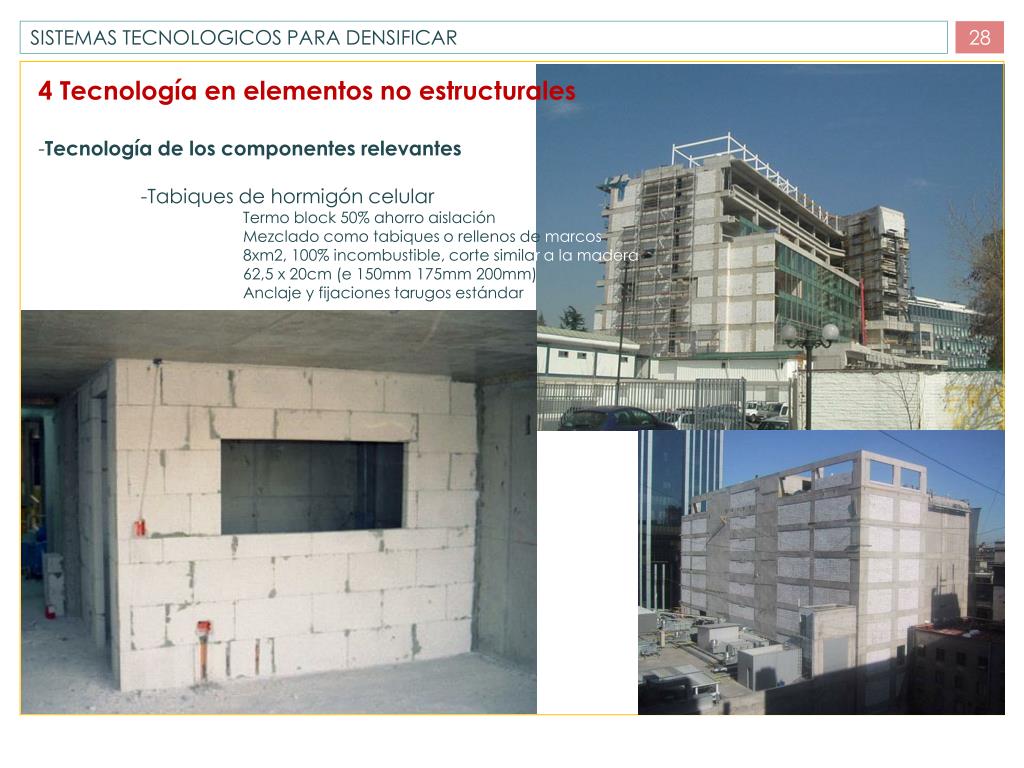 SISTEMAS TECNOLOGICOS PARA DENSIFICAR 28 4 Tecnología en elementos no estructurales -Tecnología de los componentes relevantes -Tabiques de hormigón celular Termo block 50% ahorro aislación Mezclado como tabiques o rellenos de marcos 8xm2, 100% incombustible, corte similara la madera 62,5 x 20cm (e 150mm 175mm 200mm) Anclaje y fijaciones tarugos estándar