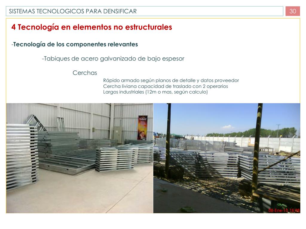 SISTEMAS TECNOLOGICOS PARA DENSIFICAR 29 4 Tecnología en elementos no estructurales -Tecnología de los componentes relevantes -Tabiques de acero galvanizado de bajo espesor Tabiques Rápido armado según planos de detalle y datos proveedor Requiere complementos para aislación y cierre de tabique