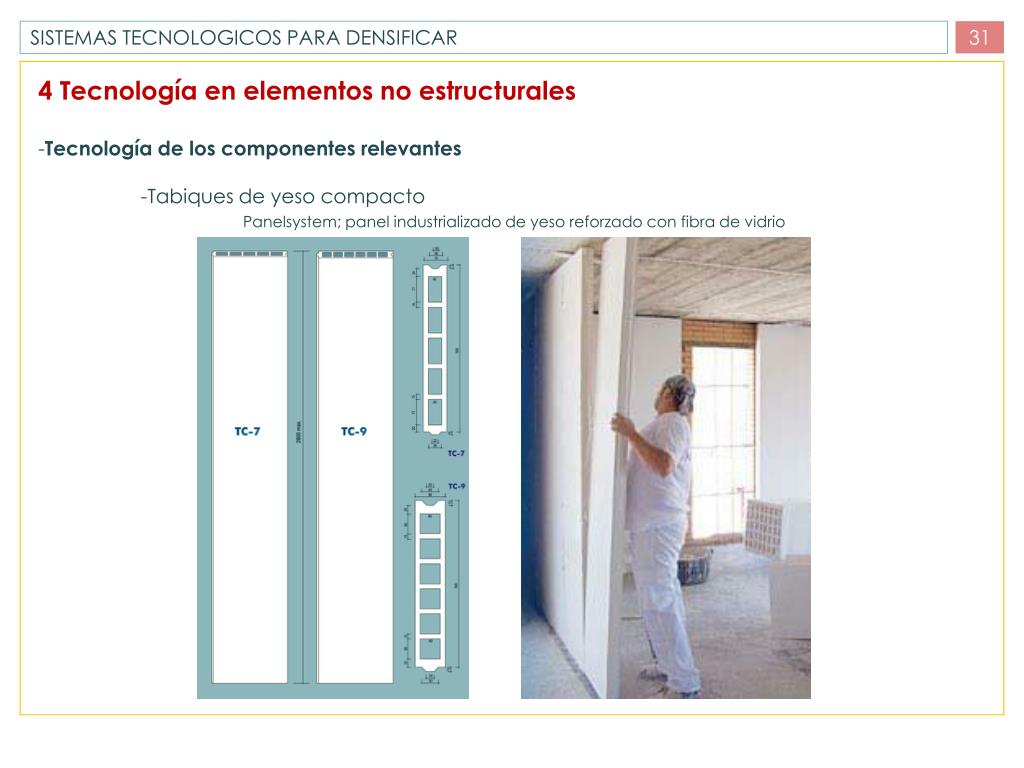 SISTEMAS TECNOLOGICOS PARA DENSIFICAR 31 4 Tecnología en elementos no estructurales -Tecnología de los componentes relevantes -Tabiques de yeso compacto Panelsystem; panel industrializado de yeso reforzado con fibra de vidrio