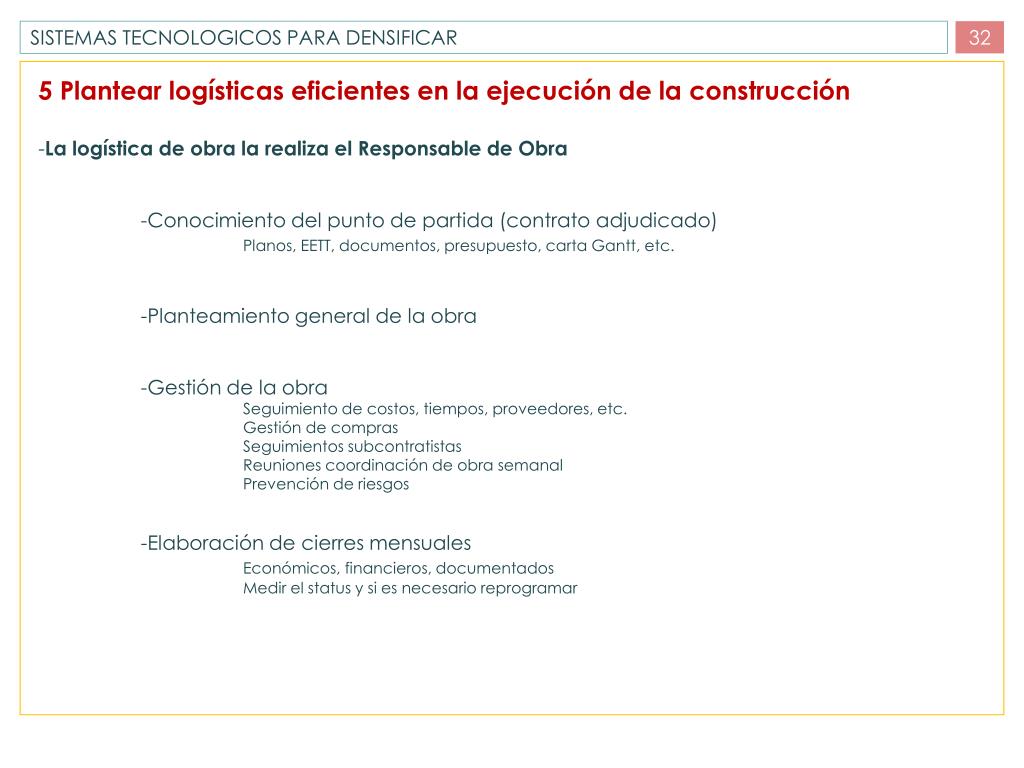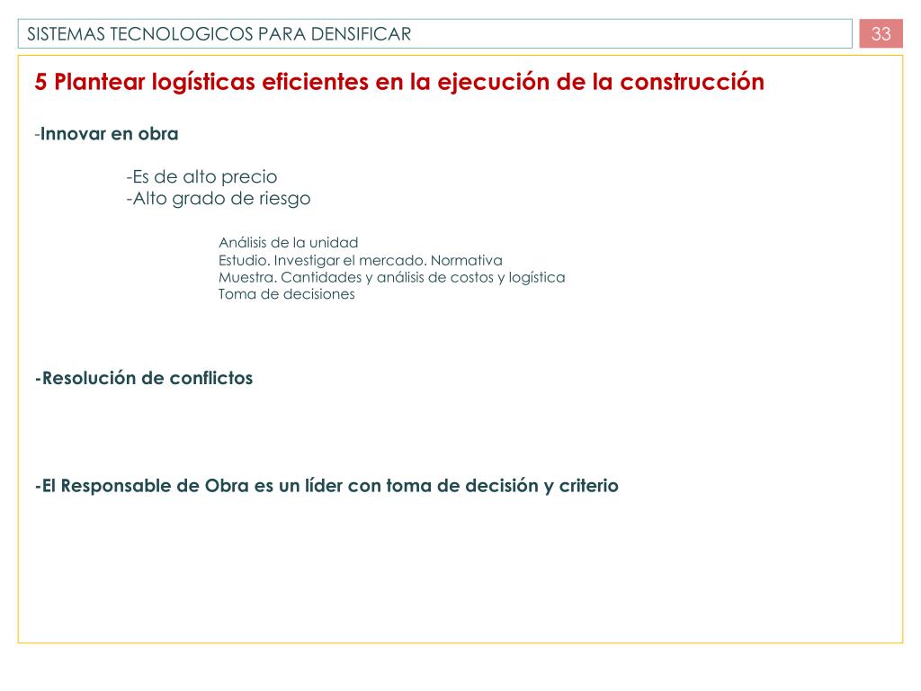 SISTEMAS TECNOLOGICOS PARA DENSIFICAR 32 5 Plantear logísticas eficientes en la ejecución de la construcción -La logística de obra la realiza el Responsable de Obra -Conocimiento del punto de partida (contrato adjudicado) Planos, EETT, documentos, presupuesto, carta Gantt, etc. -Planteamiento general de la obra -Gestión de la obra Seguimiento de costos, tiempos, proveedores, etc. Gestión de compras Seguimientos subcontratistas Reuniones coordinación de obra semanal Prevención de riesgos -Elaboración de cierres mensuales Económicos, financieros, documentados Medir el status y si es necesario reprogramar