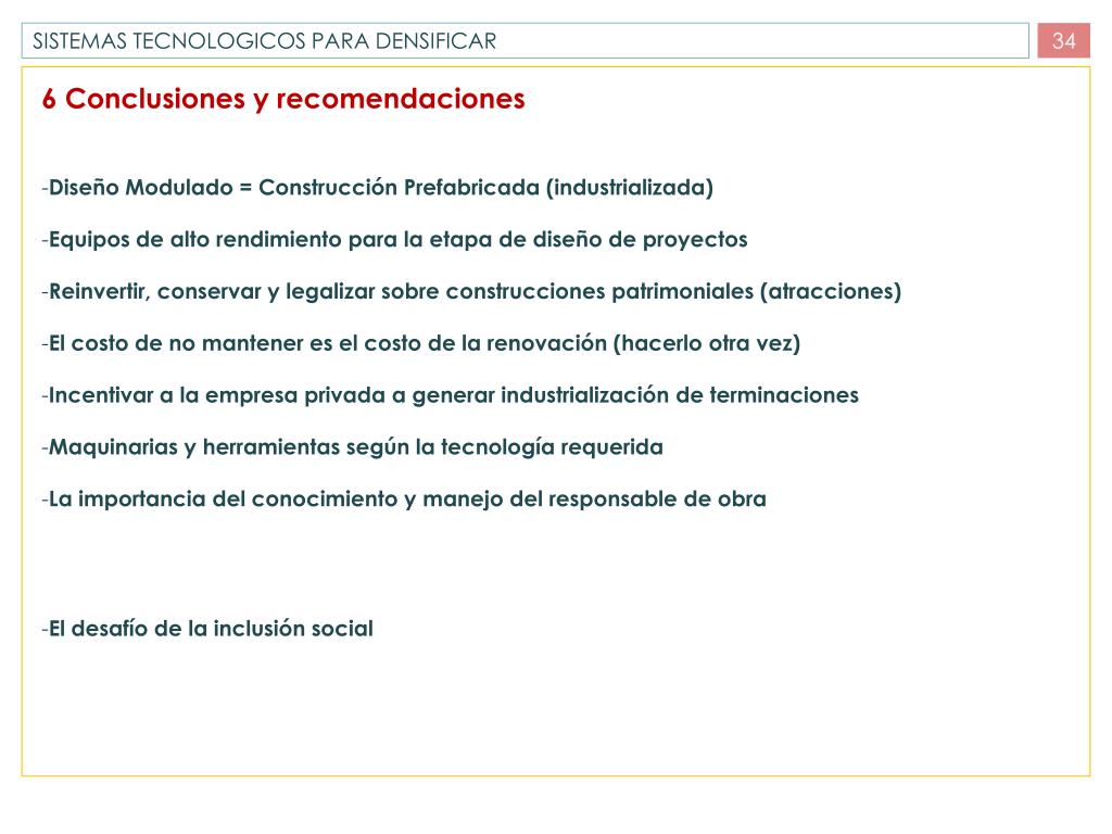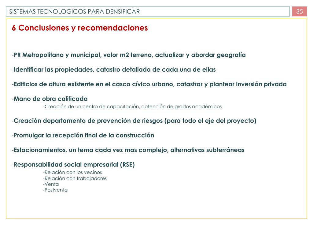 SISTEMAS TECNOLOGICOS PARA DENSIFICAR 35 6 Conclusiones y recomendaciones -PR Metropolitano y municipal, valor m2 terreno, actualizar y abordar geografía -Identificar las propiedades, catastro detallado de cada una de ellas -Edificios de altura existente en el casco cívico urbano, catastrar y plantear inversión privada -Mano de obra calificada -Creación de un centro de capacitación, obtención de grados académicos -Creación departamento de prevención de riesgos (para todo el eje del proyecto) -Promulgar la recepción final de la construcción -Estacionamientos, un tema cada vez mas complejo, alternativas subterráneas -Responsabilidad social empresarial (RSE) -Relación con los vecinos -Relación con trabajadores -Venta -Postventa