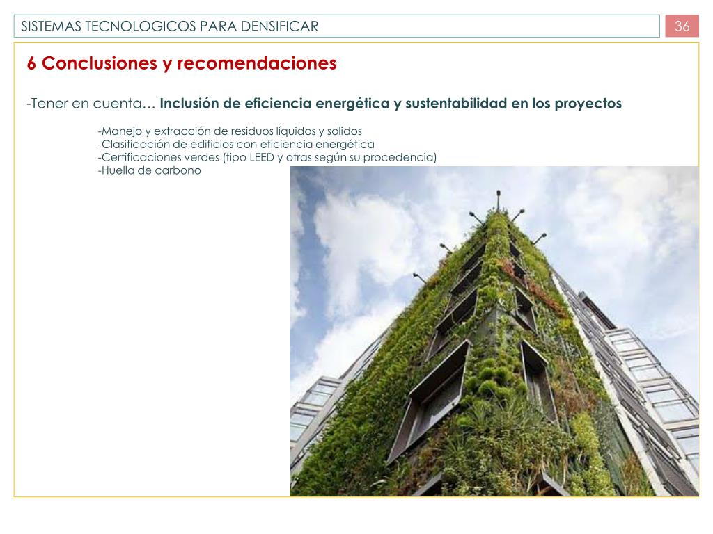 SISTEMAS TECNOLOGICOS PARA DENSIFICAR 36 6 Conclusiones y recomendaciones -Tener en cuenta… Inclusión de eficiencia energética y sustentabilidad en los proyectos -Manejo y extracción de residuos líquidos y solidos -Clasificación de edificios con eficiencia energética -Certificaciones verdes (tipo LEED y otras según su procedencia) -Huella de carbono