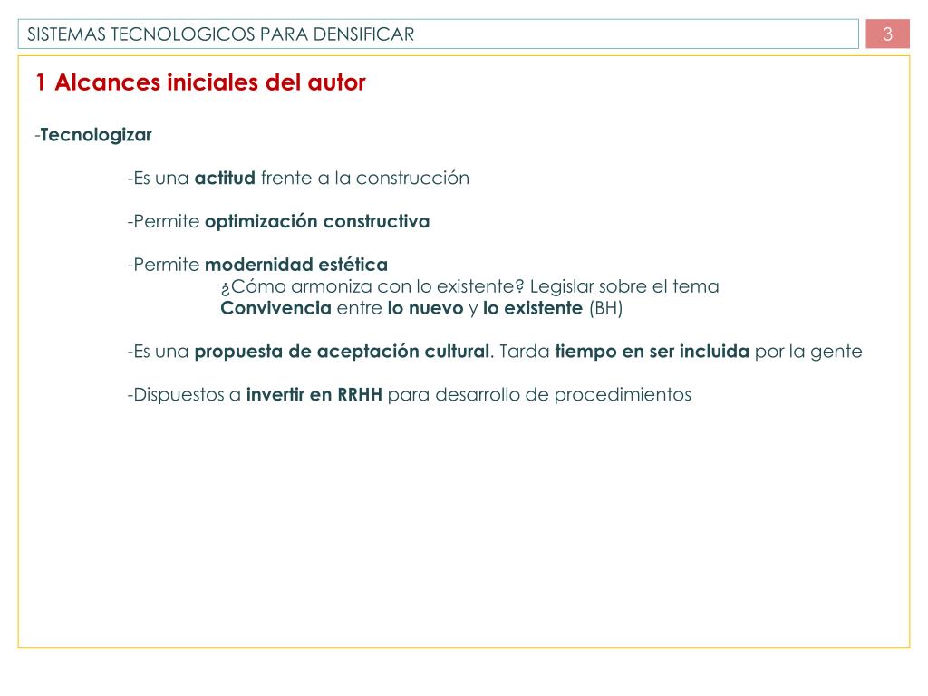 SISTEMAS TECNOLOGICOS PARA DENSIFICAR 3 1 Alcances iniciales del autor -Tecnologizar -Es una actitud frente a la construcción -Permite optimización constructiva -Permite modernidad estética ¿Cómo armoniza con lo existente? Legislar sobre el tema Convivencia entre lo nuevo y lo existente (BH) -Es una propuesta de aceptación cultural. Tarda tiempo en ser incluida por la gente -Dispuestos a invertir en RRHH para desarrollo de procedimientos