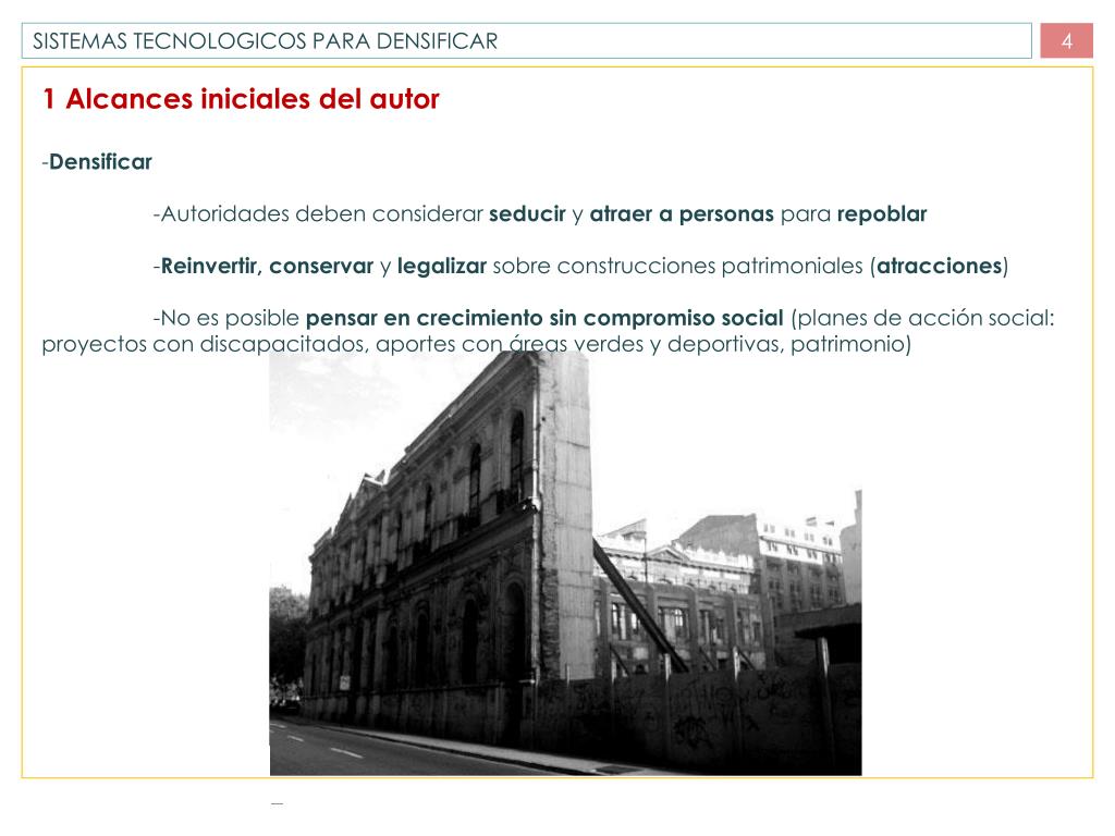 SISTEMAS TECNOLOGICOS PARA DENSIFICAR 4 1 Alcances iniciales del autor -Densificar -Autoridades deben considerar seducir y atraer a personas para repoblar -Reinvertir, conservar y legalizar sobre construcciones patrimoniales (atracciones) -No es posible pensar en crecimiento sin compromiso social (planes de acción social: proyectos con discapacitados, aportes con áreas verdes y deportivas, patrimonio)