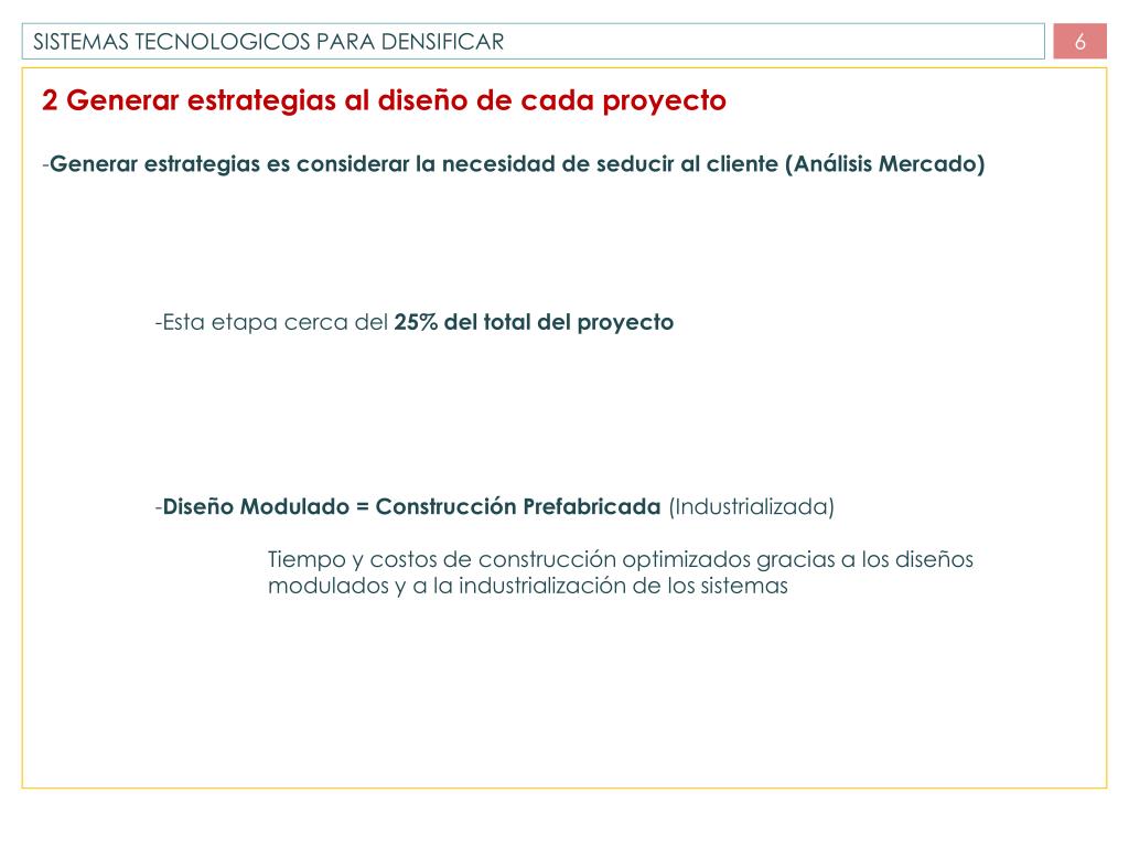 SISTEMAS TECNOLOGICOS PARA DENSIFICAR 6 2 Generar estrategias al diseño de cada proyecto -Generar estrategias es considerar la necesidad de seducir al cliente (Análisis Mercado) -Esta etapa cerca del 25% del total del proyecto -Diseño Modulado = Construcción Prefabricada (Industrializada) Tiempo y costos de construcción optimizados gracias a los diseños modulados y a la industrialización de los sistemas