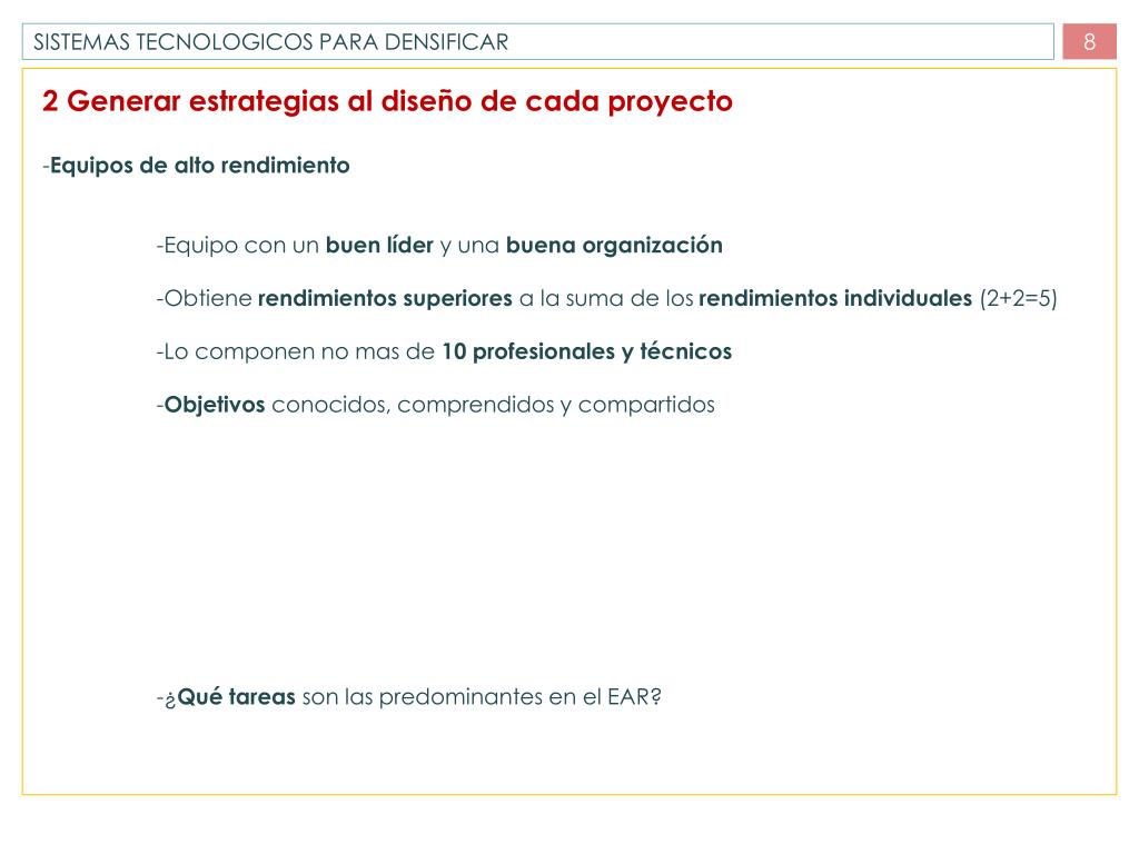 SISTEMAS TECNOLOGICOS PARA DENSIFICAR 8 2 Generar estrategias al diseño de cada proyecto -Equipos de alto rendimiento -Equipo con un buen líder y una buena organización -Obtiene rendimientos superiores a la suma de los rendimientos individuales (2+2=5) -Lo componen no mas de 10 profesionales y técnicos -Objetivos conocidos, comprendidos y compartidos -¿Qué tareas son las predominantes en el EAR?