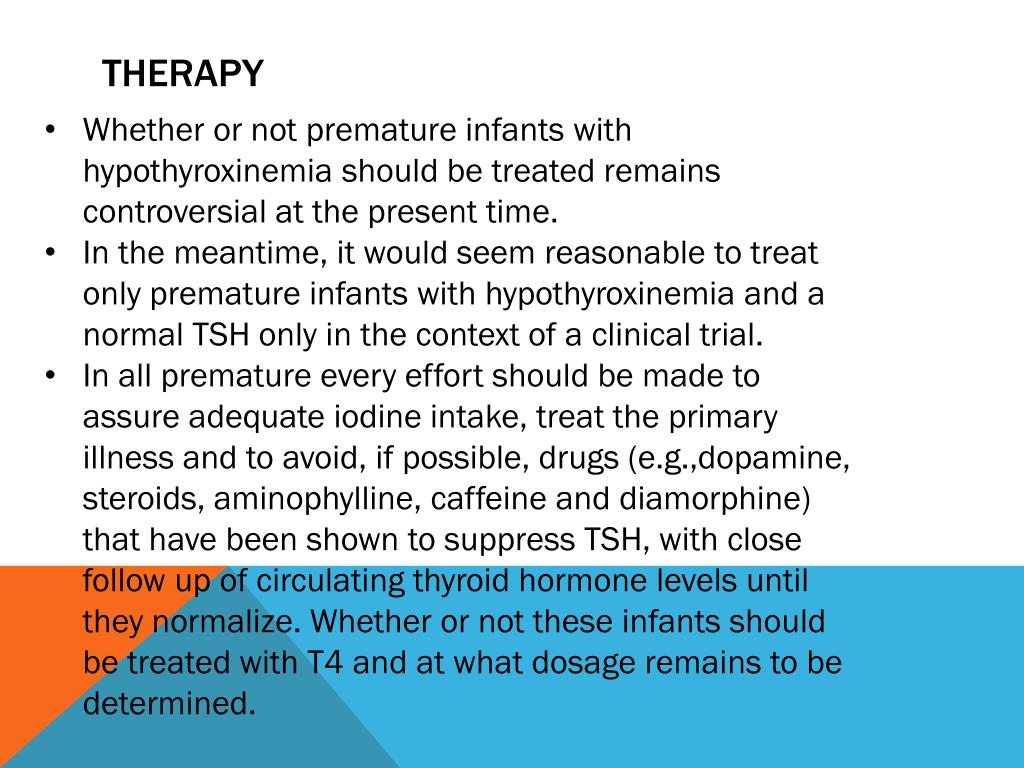 Therapy • Whether or not premature infants with hypothyroxinemia should be treated remains controversial at the present time. • In the meantime, it would seem reasonable to treat only premature infants with hypothyroxinemia and a normal TSH only in the context of a clinical trial. • In all premature every effort should be made to assure adequate iodine intake, treat the primary illness and to avoid, if possible, drugs (e.g.,dopamine, steroids, aminophylline, caffeine and diamorphine) that have been shown to suppress TSH, with close follow up of circulating thyroid hormone levels until they normalize. Whether or not these infants should be treated with T4 and at what dosage remains to be determined.