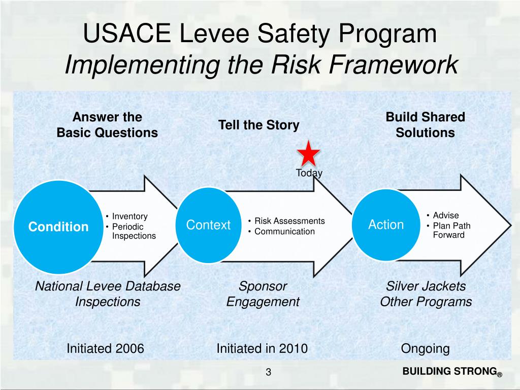 USACE Levee Safety ProgramImplementing the Risk Framework Answer the Basic Questions Build Shared Solutions Tell the Story • National Levee Database • Inspections • Initiated 2006 • Sponsor Engagement • Initiated in 2010 • Silver Jackets • Other Programs • Ongoing Today