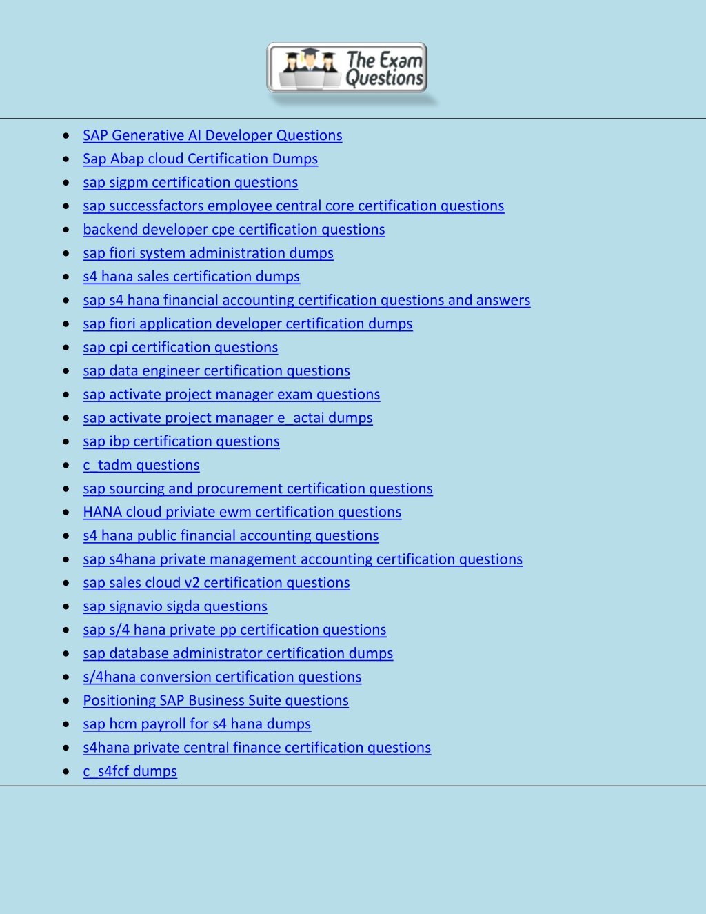 1. SAP Certification Dumps.We provide online Certification questions, Books, Study material and Dumps. An online community where you'll find exam dumps and free practice tests for almost any certification, we help you work smarter not harder at TheExamQuestions.com.Latest SAP Generative AI Developer Certification Questions ✅, C_AIG_2412 dumps ✅ , Free Sample questions ✅ , Similar to actual exam ✅ , Books Download ✅ , Pass Guaranteed ✅ , Unlimited access to course ✅ Lat est Back-End Developer - ABAP Cloud Certification Questions ✅, C_ABAPD_2507 dumps ✅ , Free Sample questions ✅ , Similar to actual exam ✅ , Books Download ✅ , Pass Guaranteed ✅ , Unlimited access to course ✅ Latest Process Management Consultant - SAP Signavio Certification Questions ✅, C_SIGPM_2403 dumps ✅ , Free Sample questions ✅ , Similar to actual exam ✅ , Books Download ✅ , Pass Guaranteed ✅ , Unlimited access to course ✅ The Exam Questions provides latest Implementation Consultant - SAP SuccessFactors Employee Central Core Certification Questions for C_THR81_2505 exam. We offer Study Material & Free Sample questions.Latest SAP S/4HANA System Administration Certification Questions ✅, C_TADM_23 dumps ✅ , Free Sample questions ✅ , Books Download ✅ , Pass Guaranteed ✅ , Unlimited access to course ✅Latest SAP S/4HANA Cloud Private Edition, Sourcing and Procurement Certification Questions ✅ , C_TS452_2410 dumps ✅ , Free Sample questions ✅ , Books Download ✅ , Pass Guaranteed ✅ , Unlimited access to course ✅ , Similar to actual ex ✅Latest SAP S/4HANA Cloud Private Edition, Management Accounting Certification Questions ✅ , C_TS4CO_2023 dumps ✅ , Free Sample questions ✅ , Books Download ✅ , Pass Guaranteed ✅ , Unlimited access to course ✅ Latest Process Data Analyst - SAP Signavio Certification Questions ✅, C_SIGDA_2403 dumps ✅ , Free Sample questions ✅ , Similar to actual exam ✅ , Books Download ✅ , Pass Guaranteed ✅ , Unlimited access to course ✅ Latest SAP S/4HANA Cloud Private Edition, Production Planning and Manufacturing Certification Questions ✅, C_TS422_2504 dumps ✅ , Free Sample questions ✅ , Books Download ✅ , Pass Guaranteed ✅ , Unlimited access to course ✅ Latest Database Administrator - SAP HANA Certification Questions ✅ , C_DBADM_2404 dumps ✅ , Free Sample questions questions ✅ , Books Download ✅ , Pass Guaranteed ✅ , Unlimited access t Download ✅ , Pass Guaranteed ✅ , Unlimited access to course ✅ , Similar to actual exam ✅ Latest SAP Business Data Cloud Certification Questions ✅ , C_BCBDC_2505 dumps ✅ , Free Sample questions ✅ , Similar to actual exa m ✅, Books Download ✅ , Pass Guaranteed ✅ , Unlimited access to course ✅SAP Business Data Cloud Certification questions am E_S4CON_2505 dumps ✅ , Free Sample o course Books
