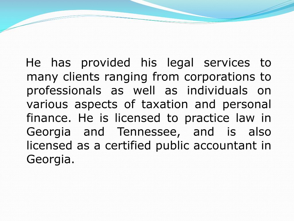 He has provided his legal services to many clients ranging from corporations to professionals as well as individuals on various aspects of taxation and personal finance. He is licensed to practice law in Georgia and Tennessee, and is also licensed as a certified public accountant in Georgia.