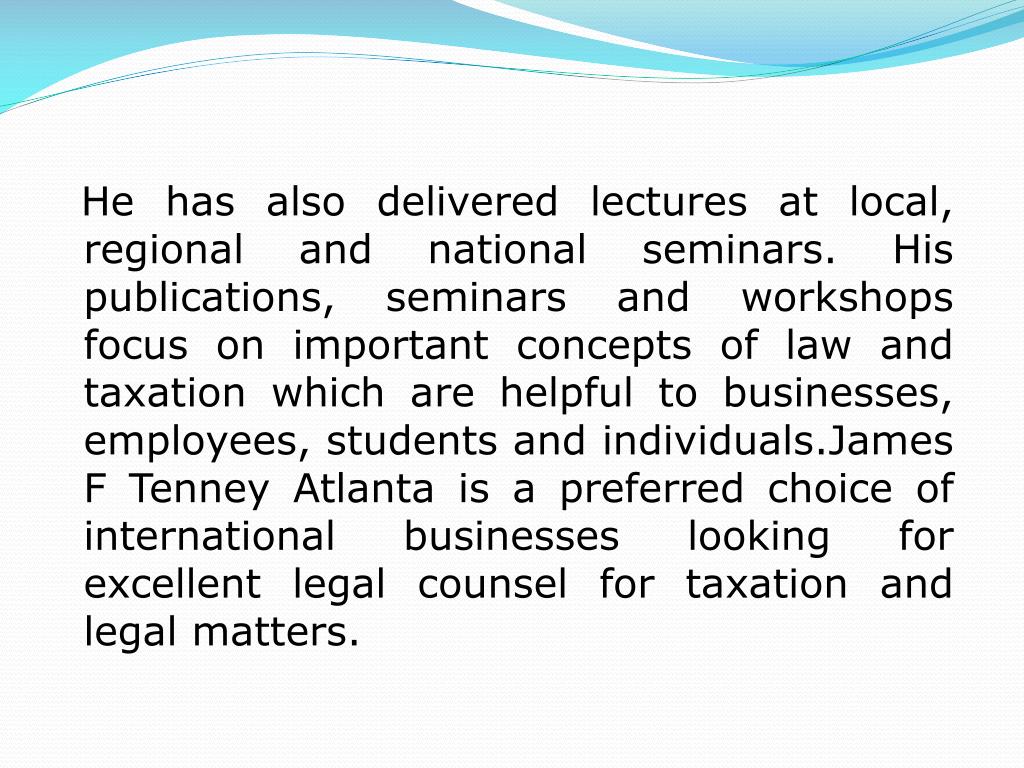 He has also delivered lectures at local, regional and national seminars. His publications, seminars and workshops focus on important concepts of law and taxation which are helpful to businesses, employees, students and individuals.James F Tenney Atlanta is a preferred choice of international businesses looking for excellent legal counsel for taxation and legal matters.