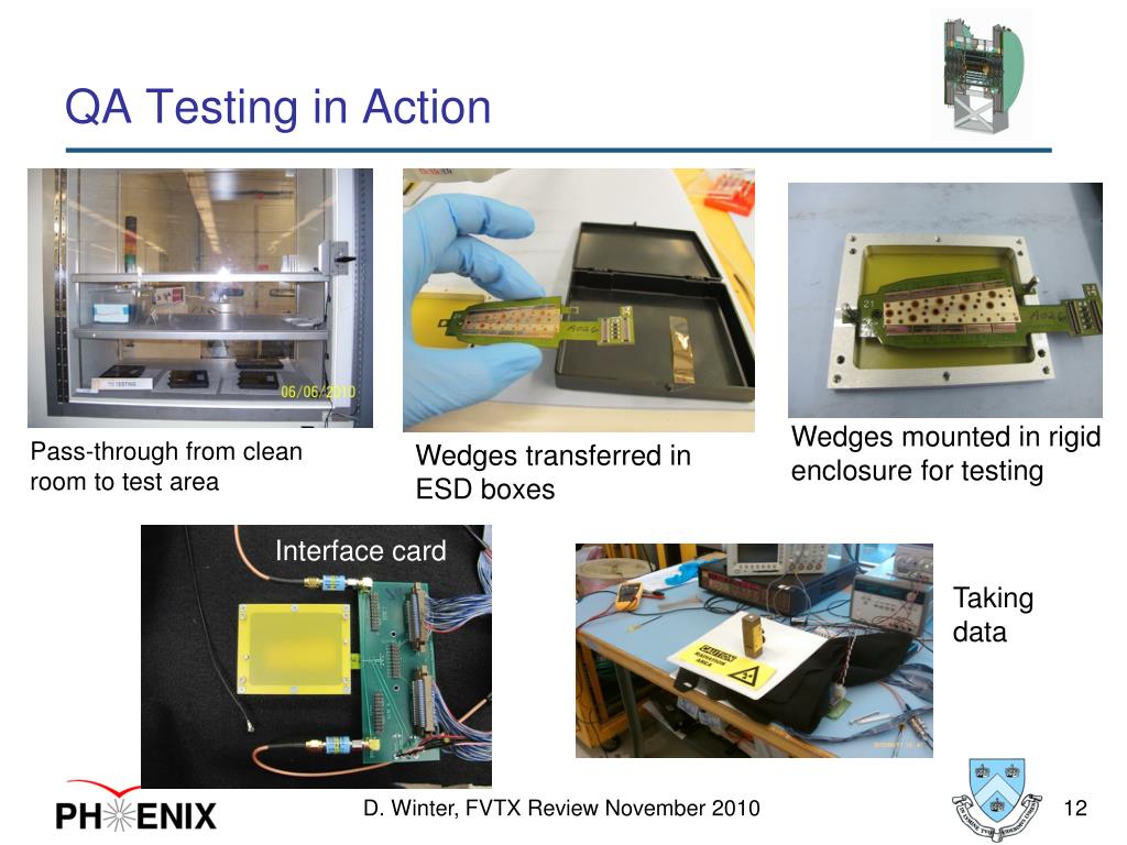 QA Testing in Action Wedges mounted in rigid enclosure for testing Pass-through from clean room to test area Wedges transferred in ESD boxes Interface card Taking data D. Winter, FVTX Review November 2010