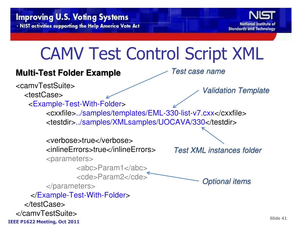 CAMV Test Control Script XML Test case name Multi-Test Folder Example <camvTestSuite> <testCase> <Example-Test-With-Folder> <cxxfile>../samples/templates/EML-330-list-v7.cxx</cxxfile> <testdir>../samples/XMLsamples/UOCAVA/330</testdir> <verbose>true</verbose> <inlineErrors>true</inlineErrors> <parameters> <abc>Param1</abc> <cde>Param2</cde> </parameters> </Example-Test-With-Folder> </testCase> </camvTestSuite> Validation Template Test XML instances folder Optional items