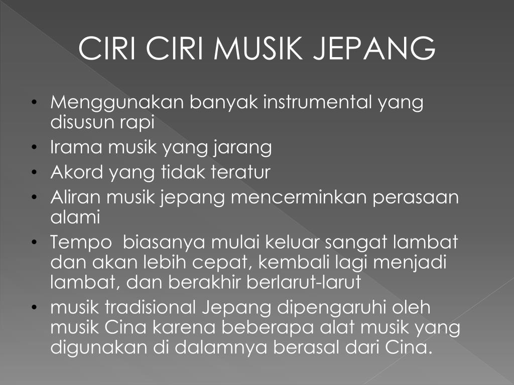 CIRI CIRI MUSIK JEPANG • Menggunakan banyak instrumental yang disusun rapi • Irama musik yang jarang • Akord yang tidak teratur • Aliran musik jepang mencerminkan perasaan alami • Tempo biasanya mulai keluar sangat lambat dan akan lebih cepat, kembali lagi menjadi lambat, dan berakhir berlarut-larut • musik tradisional Jepang dipengaruhi oleh musik Cina karena beberapa alat musik yang digunakan di dalamnya berasal dari Cina.