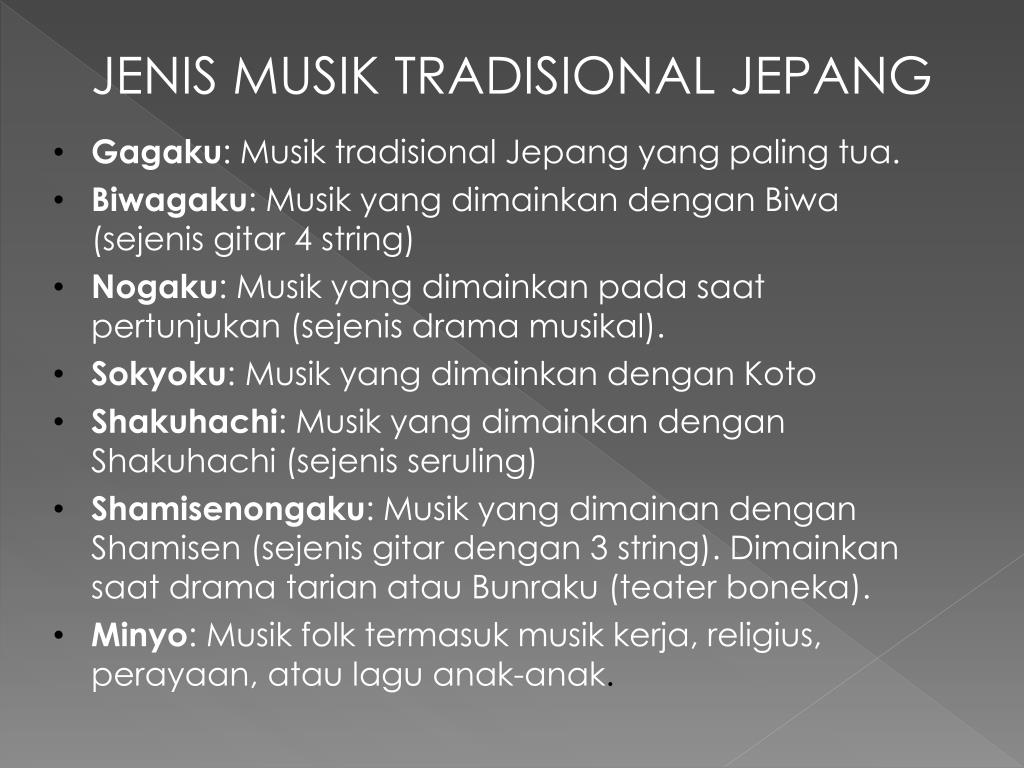 JENIS MUSIK TRADISIONAL JEPANG • Gagaku: Musik tradisional Jepang yang paling tua. • Biwagaku: Musik yang dimainkan dengan Biwa (sejenis gitar 4 string) • Nogaku: Musik yang dimainkan pada saat pertunjukan (sejenis drama musikal). • Sokyoku: Musik yang dimainkan dengan Koto • Shakuhachi: Musik yang dimainkan dengan Shakuhachi (sejenis seruling) • Shamisenongaku: Musik yang dimainan dengan Shamisen (sejenis gitar dengan 3 string). Dimainkan saat drama tarian atau Bunraku (teater boneka). • Minyo: Musik folk termasuk musik kerja, religius, perayaan, atau lagu anak-anak.