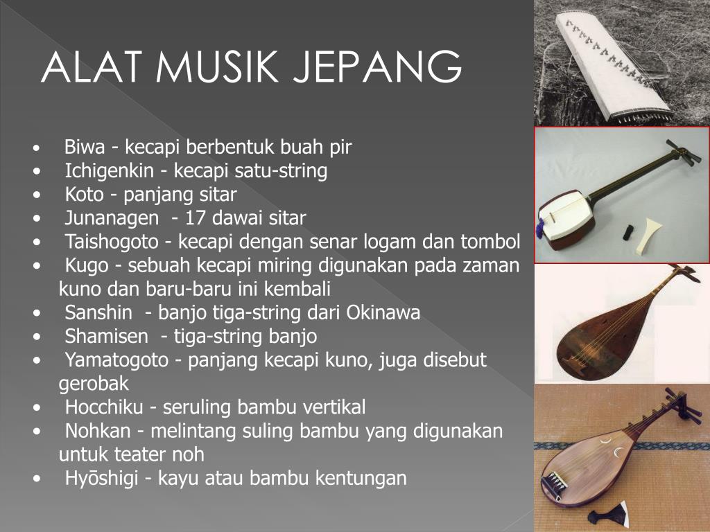 ALAT MUSIK JEPANG • Biwa - kecapi berbentuk buah pir • Ichigenkin - kecapi satu-string • Koto - panjang sitar • Junanagen - 17 dawai sitar • Taishogoto - kecapi dengan senar logam dan tombol • Kugo - sebuah kecapi miring digunakan pada zaman kuno dan baru-baru ini kembali • Sanshin - banjo tiga-string dari Okinawa • Shamisen - tiga-string banjo • Yamatogoto - panjang kecapi kuno, juga disebut gerobak • Hocchiku - seruling bambu vertikal • Nohkan - melintang suling bambu yang digunakan untuk teater noh • Hyōshigi - kayu atau bambu kentungan