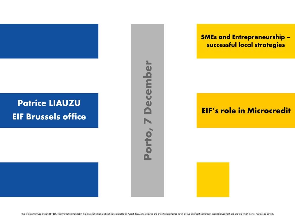 SMEs and Entrepreneurship – successful local strategies Patrice LIAUZU EIF Brussels office EIF’s role in Microcredit Porto, 7 December This presentation was prepared by EIF. The information included in this presentation is based on figures available for August 2007. Any estimates and projections contained herein involve significant elements of subjective judgment and analysis, which may or may not be correct.