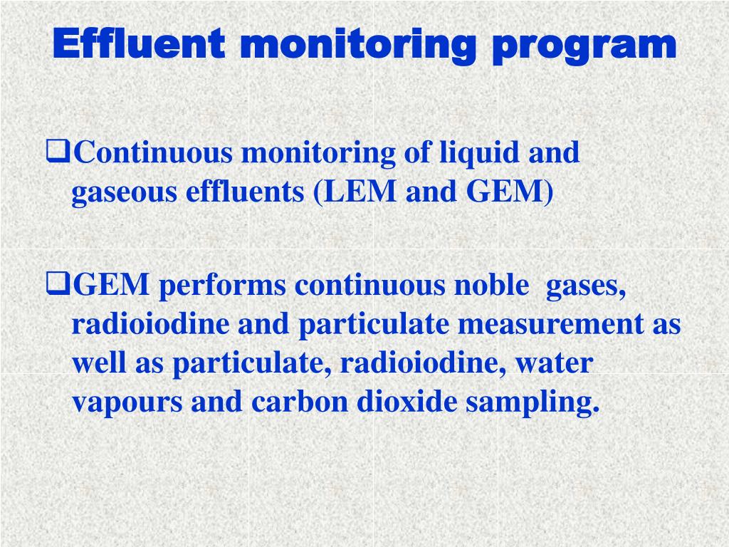 Effluent monitoring program • Continuous monitoring of liquid and gaseous effluents (LEM and GEM) • GEM performs continuous noble gases, radioiodine and particulate measurement as well as particulate, radioiodine, water vapours and carbon dioxide sampling.