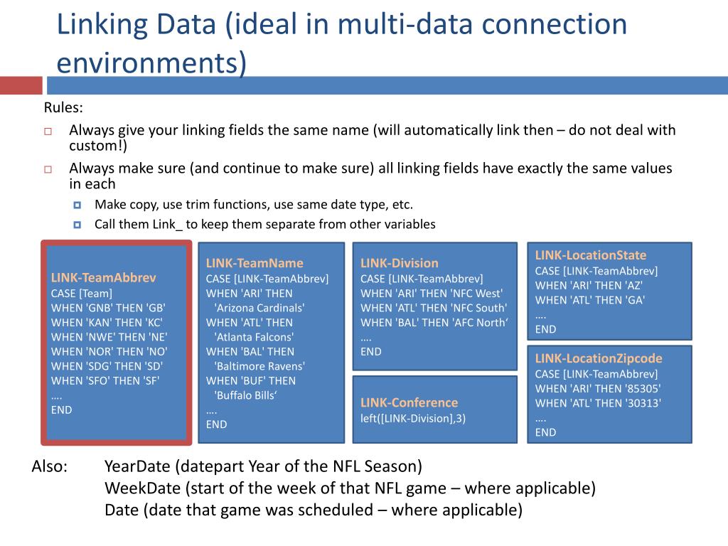 Linking Data (ideal in multi-data connection environments) Rules: • Always give your linking fields the same name (will automatically link then – do not deal with custom!) • Always make sure (and continue to make sure) all linking fields have exactly the same values in each • Make copy, use trim functions, use same date type, etc. • Call them Link_ to keep them separate from other variables LINK-TeamAbbrev CASE [Team] WHEN 'GNB' THEN 'GB' WHEN 'KAN' THEN 'KC' WHEN 'NWE' THEN 'NE' WHEN 'NOR' THEN 'NO' WHEN 'SDG' THEN 'SD' WHEN 'SFO' THEN 'SF' …. END LINK-TeamName CASE [LINK-TeamAbbrev] WHEN 'ARI' THEN 'Arizona Cardinals' WHEN 'ATL' THEN 'Atlanta Falcons' WHEN 'BAL' THEN 'Baltimore Ravens' WHEN 'BUF' THEN 'Buffalo Bills‘ …. END LINK-Division CASE [LINK-TeamAbbrev] WHEN 'ARI' THEN 'NFC West' WHEN 'ATL' THEN 'NFC South' WHEN 'BAL' THEN 'AFC North‘ …. END LINK-LocationState CASE [LINK-TeamAbbrev] WHEN 'ARI' THEN 'AZ' WHEN 'ATL' THEN 'GA' …. END LINK-LocationZipcode CASE [LINK-TeamAbbrev] WHEN 'ARI' THEN '85305' WHEN 'ATL' THEN '30313' …. END LINK-Conference left([LINK-Division],3) Also: YearDate (datepart Year of the NFL Season) WeekDate (start of the week of that NFL game – where applicable) Date (date that game was scheduled – where applicable)