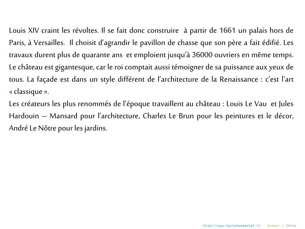 Louis XIV craint les révoltes. Il se fait donc construire à partir de 1661 un palais hors de Paris, à Versailles. Il choisit d’agrandir le pavillon de chasse que son père a fait édifié. Les travaux durent plus de quarante ans et emploient jusqu’à 36000 ouvriers en même temps. Le château est gigantesque, car le roi comptait aussi témoigner de sa puissance aux yeux de tous. La façade est dans un style différent de l’architecture de la Renaissance : c’est l’art « classique ». Les créateurs les plus renommés de l’époque travaillent au château : Louis Le Vau et Jules Hardouin – Mansard pour l’architecture, Charles Le Brun pour les peintures et le décor, André Le Nôtre pour les jardins. http://www.laclassedestef.fr Auteur : Chris