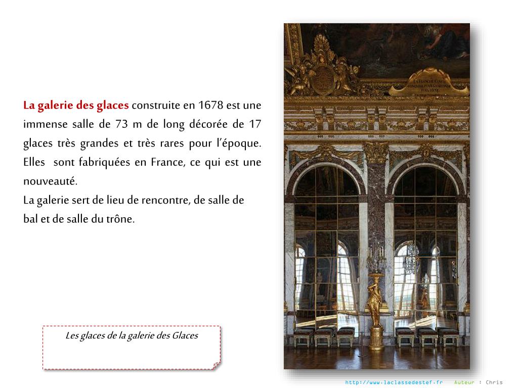 La galerie des glacesconstruite en 1678 est une immense salle de 73 m de long décorée de 17 glaces très grandes et très rares pour l’époque. Elles sont fabriquées en France, ce qui est une nouveauté. La galerie sert de lieu de rencontre, de salle de bal et de salle du trône. Les glaces de la galerie des Glaces http://www.laclassedestef.fr Auteur : Chris