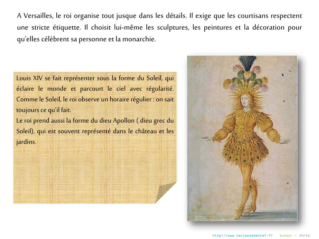 A Versailles, le roi organise tout jusque dans les détails. Il exige que les courtisans respectent une stricte étiquette. Il choisit lui-même les sculptures, les peintures et la décoration pour qu’elles célèbrent sa personne et la monarchie. Louis XIV se fait représenter sous la forme du Soleil, qui éclaire le monde et parcourt le ciel avec régularité. Comme le Soleil, le roi observe un horaire régulier : on sait toujours ce qu’il fait. Le roi prend aussi la forme du dieu Apollon ( dieu grec du Soleil), qui est souvent représenté dans le château et les jardins. http://www.laclassedestef.fr Auteur : Chris