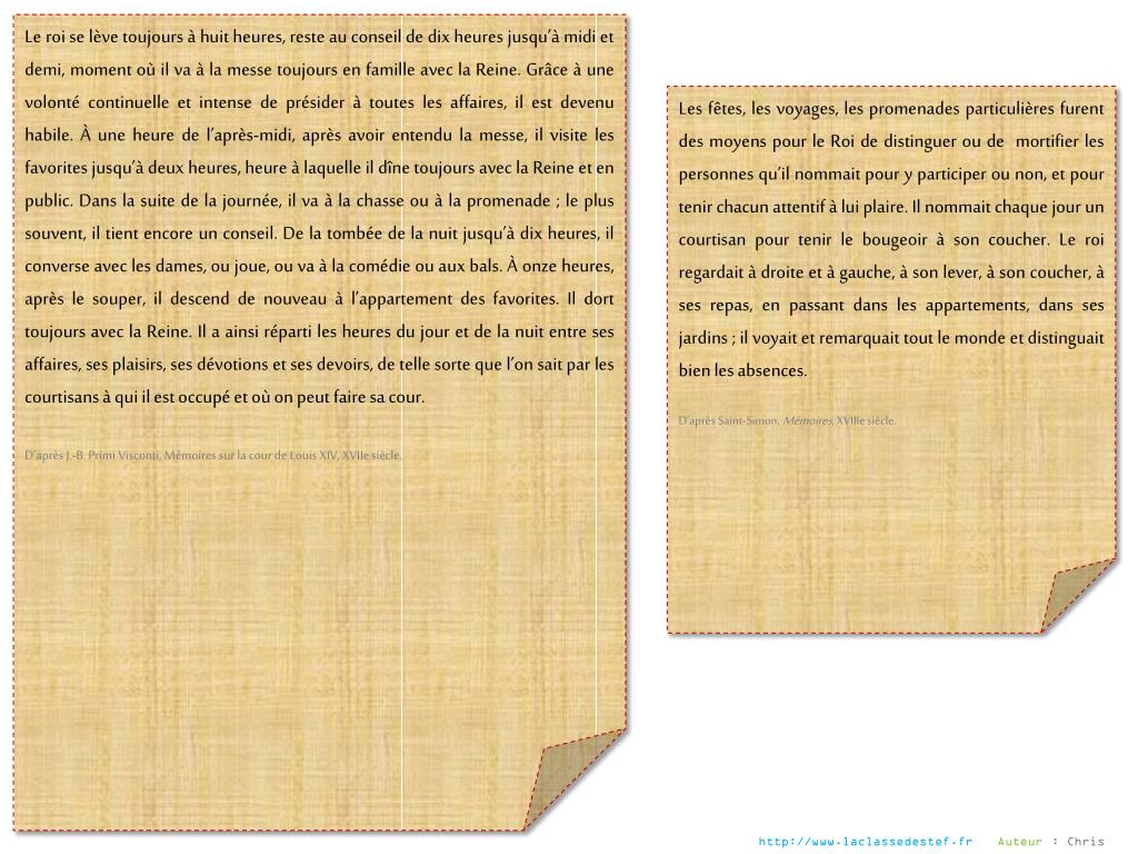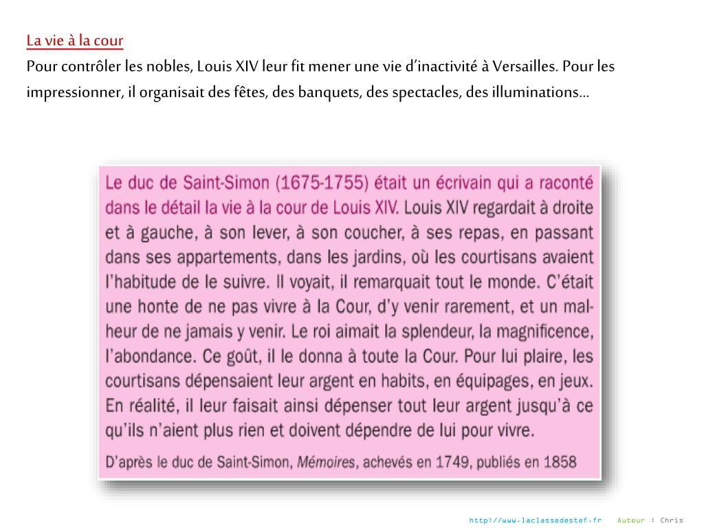 Le roi se lève toujours à huit heures, reste au conseil de dix heures jusqu’à midi et demi, moment où il va à la messe toujours en famille avec la Reine. Grâce à une volonté continuelle et intense de présider à toutes les affaires, il est devenu habile. À une heure de l’après-midi, après avoir entendu la messe, il visite les favorites jusqu’à deux heures, heure à laquelle il dîne toujours avec la Reine et en public. Dans la suite de la journée, il va à la chasse ou à la promenade ; le plus souvent, il tient encore un conseil. De la tombée de la nuit jusqu’à dix heures, il converse avec les dames, ou joue, ou va à la comédie ou aux bals. À onze heures, après le souper, il descend de nouveau à l’appartement des favorites. Il dort toujours avec la Reine. Il a ainsi réparti les heures du jour et de la nuit entre ses affaires, ses plaisirs, ses dévotions et ses devoirs, de telle sorte que l’on sait par les courtisans à qui il est occupé et où on peut faire sa cour. D’après J.-B. Primi Visconti, Mémoires sur la cour de Louis XIV, XVIIe siècle. Les fêtes, les voyages, les promenades particulières furent des moyens pour le Roi de distinguer ou de mortifier les personnes qu’il nommait pour y participer ou non, et pour tenir chacun attentif à lui plaire. Il nommait chaque jour un courtisan pour tenir le bougeoir à son coucher. Le roi regardait à droite et à gauche, à son lever, à son coucher, à ses repas, en passant dans les appartements, dans ses jardins ; il voyait et remarquait tout le monde et distinguait bien les absences. D’après Saint-Simon, Mémoires, XVIIIe siècle. http://www.laclassedestef.fr Auteur : Chris