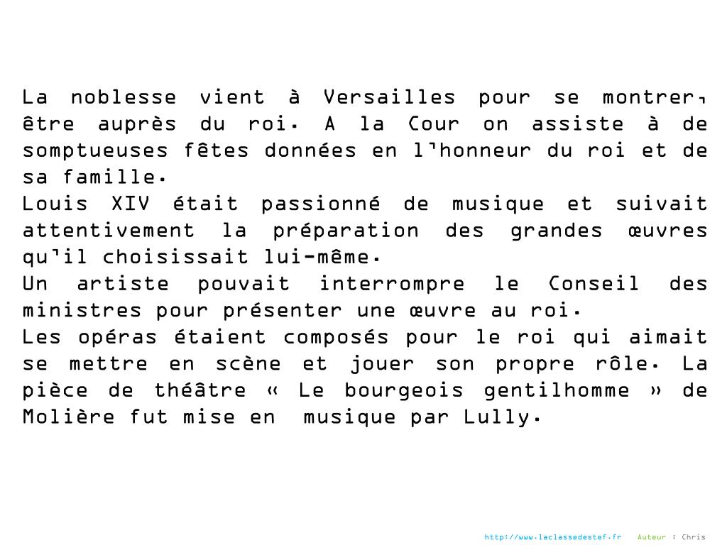 La noblesse vient à Versailles pour se montrer, être auprès du roi. A la Cour on assiste à de somptueuses fêtes données en l’honneur du roi et de sa famille. Louis XIV était passionné de musique et suivait attentivement la préparation des grandes œuvres qu’il choisissait lui-même. Un artiste pouvait interrompre le Conseil des ministres pour présenter une œuvre au roi. Les opéras étaient composés pour le roi qui aimait se mettre en scène et jouer son propre rôle. La pièce de théâtre « Le bourgeois gentilhomme » de Molière fut mise en musique par Lully. http://www.laclassedestef.fr Auteur : Chris