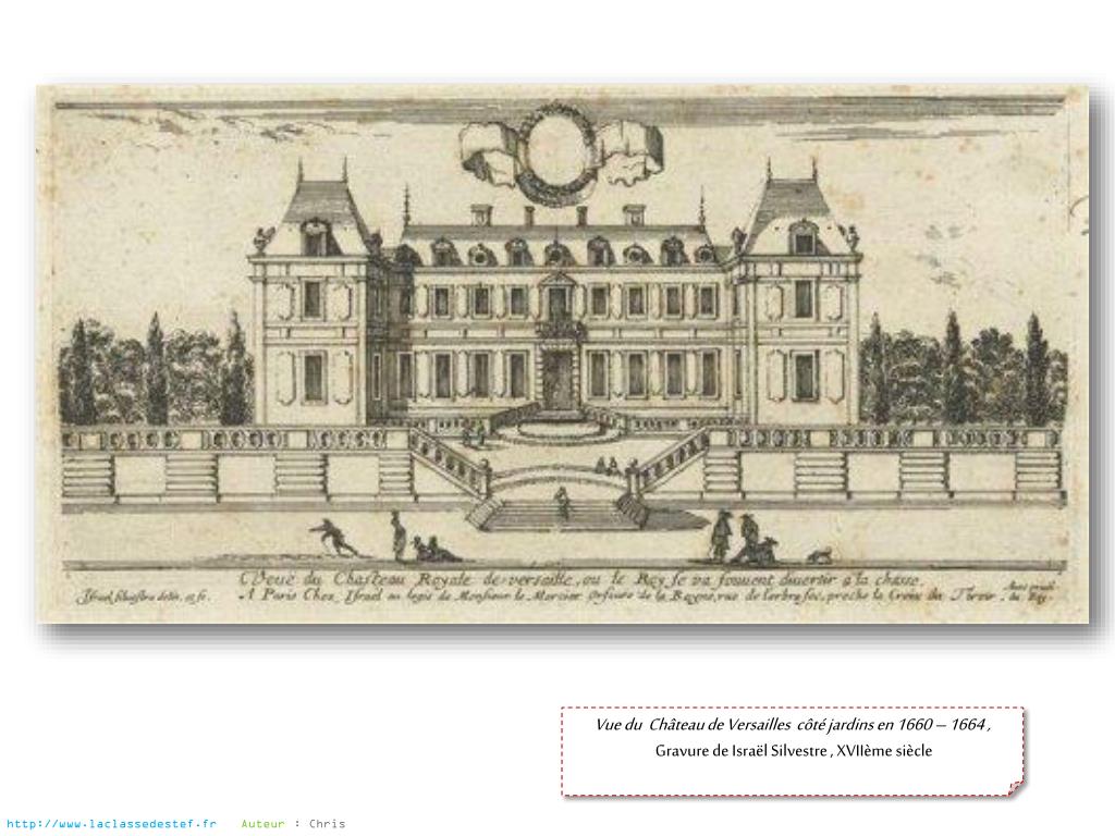 Vue du Château de Versailles côté jardins en 1660 – 1664 , Gravure de Israël Silvestre , XVIIème siècle http://www.laclassedestef.fr Auteur : Chris