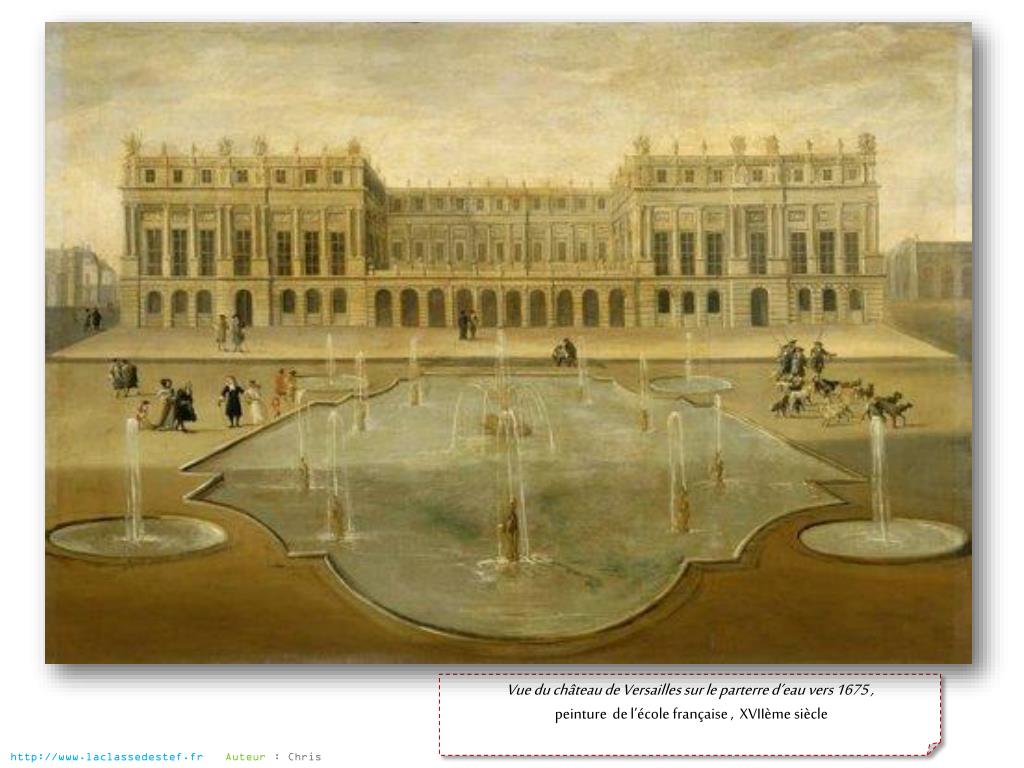 Vue du château de Versailles sur le parterre d’eau vers 1675 , peinture de l’école française , XVIIème siècle http://www.laclassedestef.fr Auteur : Chris