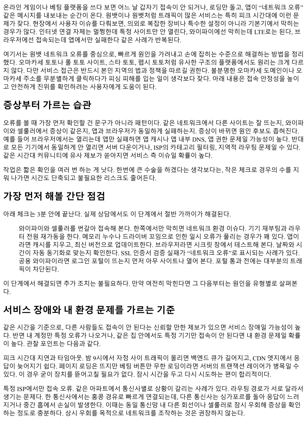 여기서 403, 429 같은응답이눈에띈다면과도한요청이나접근정책문제가시사된다. 522, 524처럼게이트웨이 타임아웃은 CDN과원서버구간의지연을의미한다. 5xx라면기다리는편이낫다. 사용자는보통이구간에개입 할수없다. 고객센터에연락할때전달하면좋은것들 지원팀과의대화는정보가많을수록빨리끝난다. 모호한 “안돼요”보다다음을정리해두면해결까지시간을단 축할수있다. 접속시각과시간대, 사용하는통신사와지역, 와이파이와셀룰러모두에서같은지, 앱버전과 OS 버전, 오류화면스크린샷, 브라우저라면개발자도구네트워크탭일부캡처. 이정도만있어도담당자는원인을 절반이상가늠한다. 내쪽에서시도한조치목록도간단히남겨두면중복안내를줄일수있다. 여기서중요한건, 의심스러운링크로안내하는제3자의메시지나임의의도메인전환을따라가지않는태도다. 오마카세주소나원뱃접속링크를자칭운영자라는사람이메시지로보내올때가있다. 공식채널이안내한경 로인지, 이미공지된장애와일치하는지확인하는습관이계정보안을지켜준다. 안정적으로쓰기위한생활수칙 네트워크오류를완전히없애기는어렵다. 다만자주겪지않도록환경을가다듬을수는있다. 집인터넷은 5 GHz를기본으로쓰고, 공유기펌웨어는분기별로점검한다. 스마트폰 OS와앱은최신버전으로유지하고, 사용 하지않는 VPN이나필터앱은지운다. 지하, 엘리베이터, 지하철터널처럼신호가약한구간에서는중요한작업 을피한다. 피크시간대에는여유를두고작업을계획한다. 무엇보다도, 무작정링크를누르지말고공식공지와 등록된도메인만사용한다. 오마카세토토든스타토토든이름이붙은서비스는그이름을악용한변종이늘존 재한다. 실전사례로보는빠른판별 한사용자는저녁마다원뱃앱에서베팅전송이실패했다. 와이파이에선실패, 셀룰러에선간헐적으로성공. 다 음날오전에는둘다문제없었다. 공유기로그를보니저녁시간대 2.4 GHz 클라이언트가포화상태였다. 5 GHz SSID를별도로만들고, 앱에서만해당 SSID를쓰도록연결하니문제빈도가뚝떨어졌다. 추가로공유기채널을 자동에서수동으로옮겨혼잡채널을피하니로딩속도도개선됐다. 다른사용자는브라우저접속은되는데앱만 “네트워크오류”를띄웠다. 안드로이드에서절전모드가강화된상 태였고, 백그라운드데이터제한이걸려있었다. 앱권한을풀고, 배터리최적화에서예외로등록하니로그인세 션이안정적으로유지됐다. 이과정에서앱캐시를지운뒤재로그인을진행했고, 이후같은문제가재현되지않 았다. 또다른사용자는사무실네트워크에서만접속이막혔다. 공용 PC에서는브라우저에보안경고가뜨고, 앱은무 응답. 네트워크팀확인결과, 카테고리필터링정책상베팅플랫폼이일괄차단이었다. 사용자단에서바꿀수 있는영역이아니었고, 개인기기와개인회선에서만접근하는것으로정리했다. 법과안전, 그리고현실적인절충 해외기반플랫폼이나민감한카테고리는국가별로접근정책이다르다. 어느지역에서는합법이고, 또다른지 역에서는제한된다. 네트워크설정을바꿔가며정책을우회하려는시도는단기적으로는접속을열어줄지몰라 도, 장기적으로는계정정지, 법적리스크, 결제수단제한으로이어질수있다. 네트워크오류를해결한다는명 목으로안전을포기하면본말이전도된다. 본인이속한지역의규정을확인하고, 합법적인범위안에서만서비 스를이용하자. 마무리조언 네트워크오류는겉으로같아보여도속사정이제각각이다. 작은실마리로범위를좁히는습관만들이면, 대부 분의문제는비전문가도스스로해결할수있다. 와이파이와셀룰러전환, 재부팅, 캐시정리, 시간동기화처럼