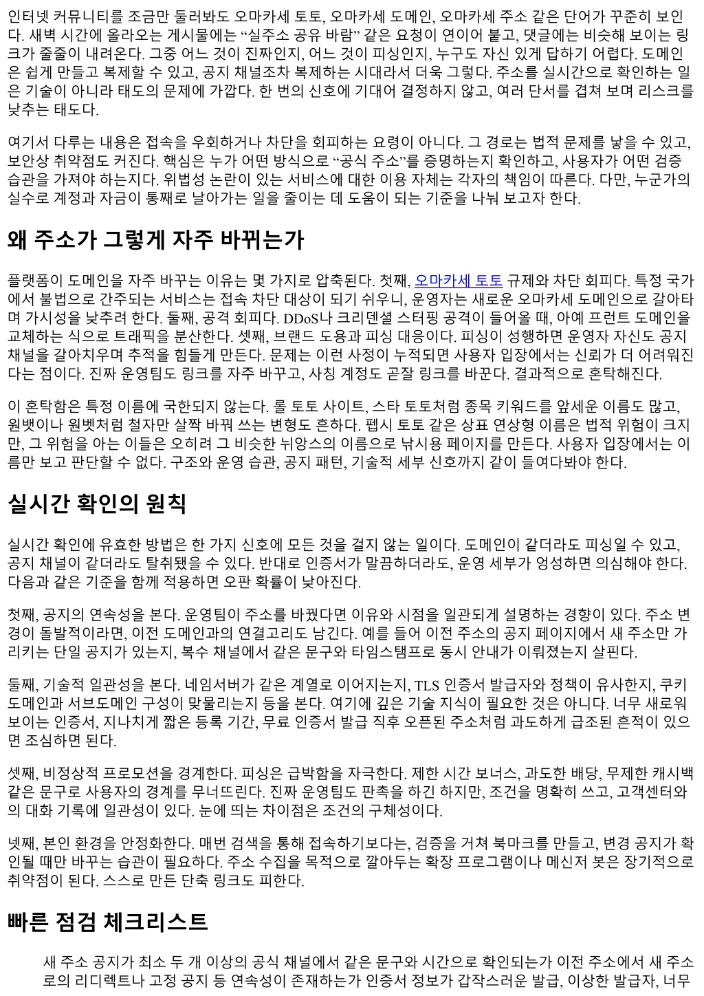 여기에더해, 주소변경공지가있을때마다로그인이전에반드시공지영역을먼저확인하는루틴을세운다. 공 지에의문이있으면기다린다. 기다림은대개비용이적다. 서두름은대부분비싼대가를치른다. 맺음 실시간주소확인은속도경쟁이아니다. 단서의품질경쟁이다. 오마카세주소든, 다른이름의주소든, 이름이 신뢰를보장해주지않는다. 공지의연속성, 기술적일관성, 비정상적신호에대한경계, 그리고자신의접속습 관이합쳐졌을때만그럴듯한확률이나온다. 선택의책임은결국사용자에게있다. 책임을가볍게만들수는없 다. 다만, 같은실수를반복하지않는방법은있다. 오늘의판단과정을기록으로남기고, 내일의판단이그기록 위에서조금더단단해지도록다듬으면된다. 주소는계속바뀌고, 피싱도계속진화한다. 변하는것속에서변하 지않는원칙을몸에익히는일, 그것이유일하게믿을만한실시간확인법이다.