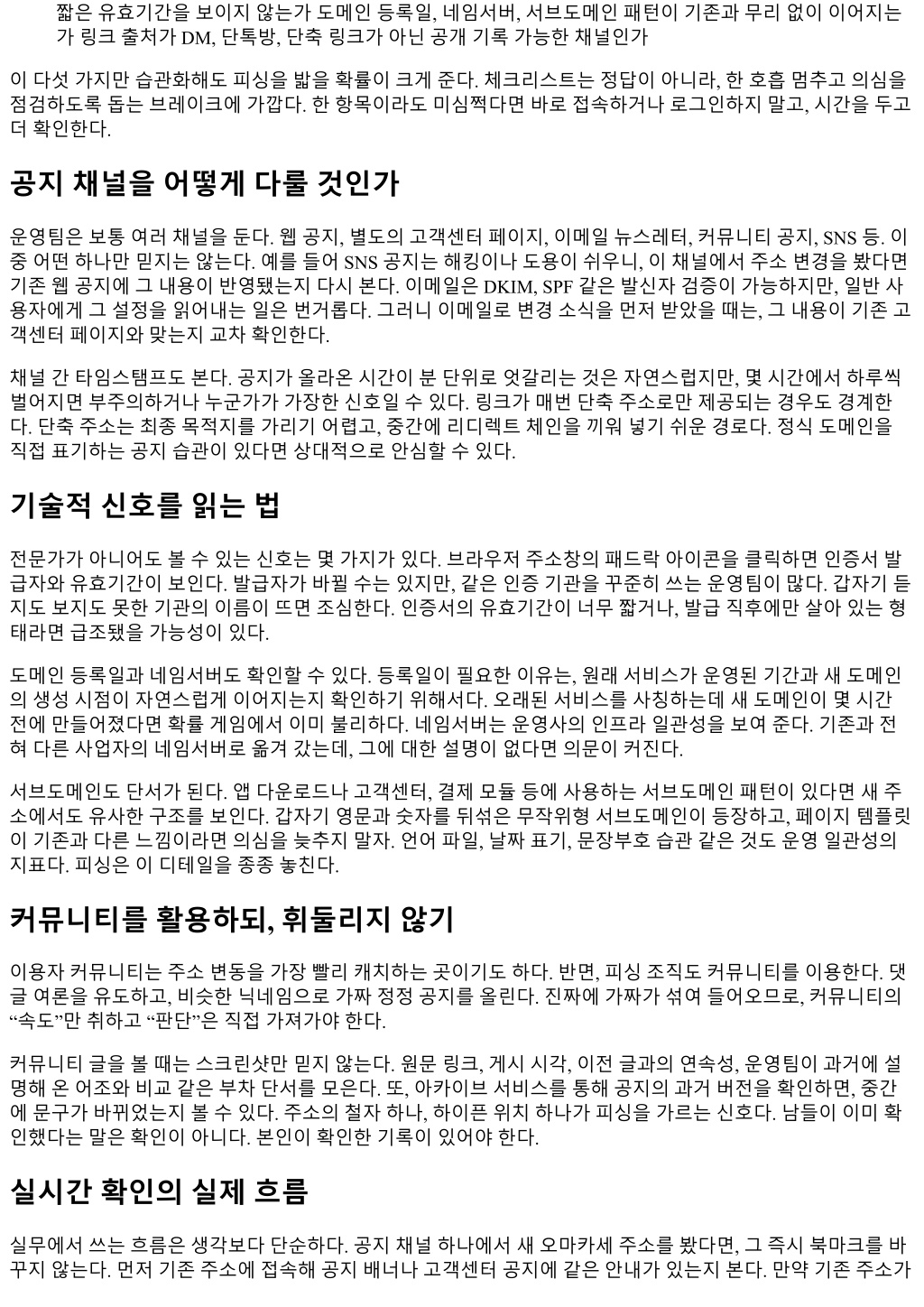 짧은유효기간을보이지않는가도메인등록일, 네임서버, 서브도메인패턴이기존과무리없이이어지는 가링크출처가 DM, 단톡방, 단축링크가아닌공개기록가능한채널인가 이다섯가지만습관화해도피싱을밟을확률이크게준다. 체크리스트는정답이아니라, 한호흡멈추고의심을 점검하도록돕는브레이크에가깝다. 한항목이라도미심쩍다면바로접속하거나로그인하지말고, 시간을두고 더확인한다. 공지채널을어떻게다룰것인가 운영팀은보통여러채널을둔다. 웹공지, 별도의고객센터페이지, 이메일뉴스레터, 커뮤니티공지, SNS 등. 이 중어떤하나만믿지는않는다. 예를들어 SNS 공지는해킹이나도용이쉬우니, 이채널에서주소변경을봤다면 기존웹공지에그내용이반영됐는지다시본다. 이메일은 DKIM, SPF 같은발신자검증이가능하지만, 일반사 용자에게그설정을읽어내는일은번거롭다. 그러니이메일로변경소식을먼저받았을때는, 그내용이기존고 객센터페이지와맞는지교차확인한다. 채널간타임스탬프도본다. 공지가올라온시간이분단위로엇갈리는것은자연스럽지만, 몇시간에서하루씩 벌어지면부주의하거나누군가가가장한신호일수있다. 링크가매번단축주소로만제공되는경우도경계한 다. 단축주소는최종목적지를가리기어렵고, 중간에리디렉트체인을끼워넣기쉬운경로다. 정식도메인을 직접표기하는공지습관이있다면상대적으로안심할수있다. 기술적신호를읽는법 전문가가아니어도볼수있는신호는몇가지가있다. 브라우저주소창의패드락아이콘을클릭하면인증서발 급자와유효기간이보인다. 발급자가바뀔수는있지만, 같은인증기관을꾸준히쓰는운영팀이많다. 갑자기듣 지도보지도못한기관의이름이뜨면조심한다. 인증서의유효기간이너무짧거나, 발급직후에만살아있는형 태라면급조됐을가능성이있다. 도메인등록일과네임서버도확인할수있다. 등록일이필요한이유는, 원래서비스가운영된기간과새도메인 의생성시점이자연스럽게이어지는지확인하기위해서다. 오래된서비스를사칭하는데새도메인이몇시간 전에만들어졌다면확률게임에서이미불리하다. 네임서버는운영사의인프라일관성을보여준다. 기존과전 혀다른사업자의네임서버로옮겨갔는데, 그에대한설명이없다면의문이커진다. 서브도메인도단서가된다. 앱다운로드나고객센터, 결제모듈등에사용하는서브도메인패턴이있다면새주 소에서도유사한구조를보인다. 갑자기영문과숫자를뒤섞은무작위형서브도메인이등장하고, 페이지템플릿 이기존과다른느낌이라면의심을늦추지말자. 언어파일, 날짜표기, 문장부호습관같은것도운영일관성의 지표다. 피싱은이디테일을종종놓친다. 커뮤니티를활용하되, 휘둘리지않기 이용자커뮤니티는주소변동을가장빨리캐치하는곳이기도하다. 반면, 피싱조직도커뮤니티를이용한다. 댓 글여론을유도하고, 비슷한닉네임으로가짜정정공지를올린다. 진짜에가짜가섞여들어오므로, 커뮤니티의 “속도”만취하고 “판단”은직접가져가야한다. 커뮤니티글을볼때는스크린샷만믿지않는다. 원문링크, 게시시각, 이전글과의연속성, 운영팀이과거에설 명해온어조와비교같은부차단서를모은다. 또, 아카이브서비스를통해공지의과거버전을확인하면, 중간 에문구가바뀌었는지볼수있다. 주소의철자하나, 하이픈위치하나가피싱을가르는신호다. 남들이이미확 인했다는말은확인이아니다. 본인이확인한기록이있어야한다. 실시간확인의실제흐름 실무에서쓰는흐름은생각보다단순하다. 공지채널하나에서새오마카세주소를봤다면, 그즉시북마크를바 꾸지않는다. 먼저기존주소에접속해공지배너나고객센터공지에같은안내가있는지본다. 만약기존주소가