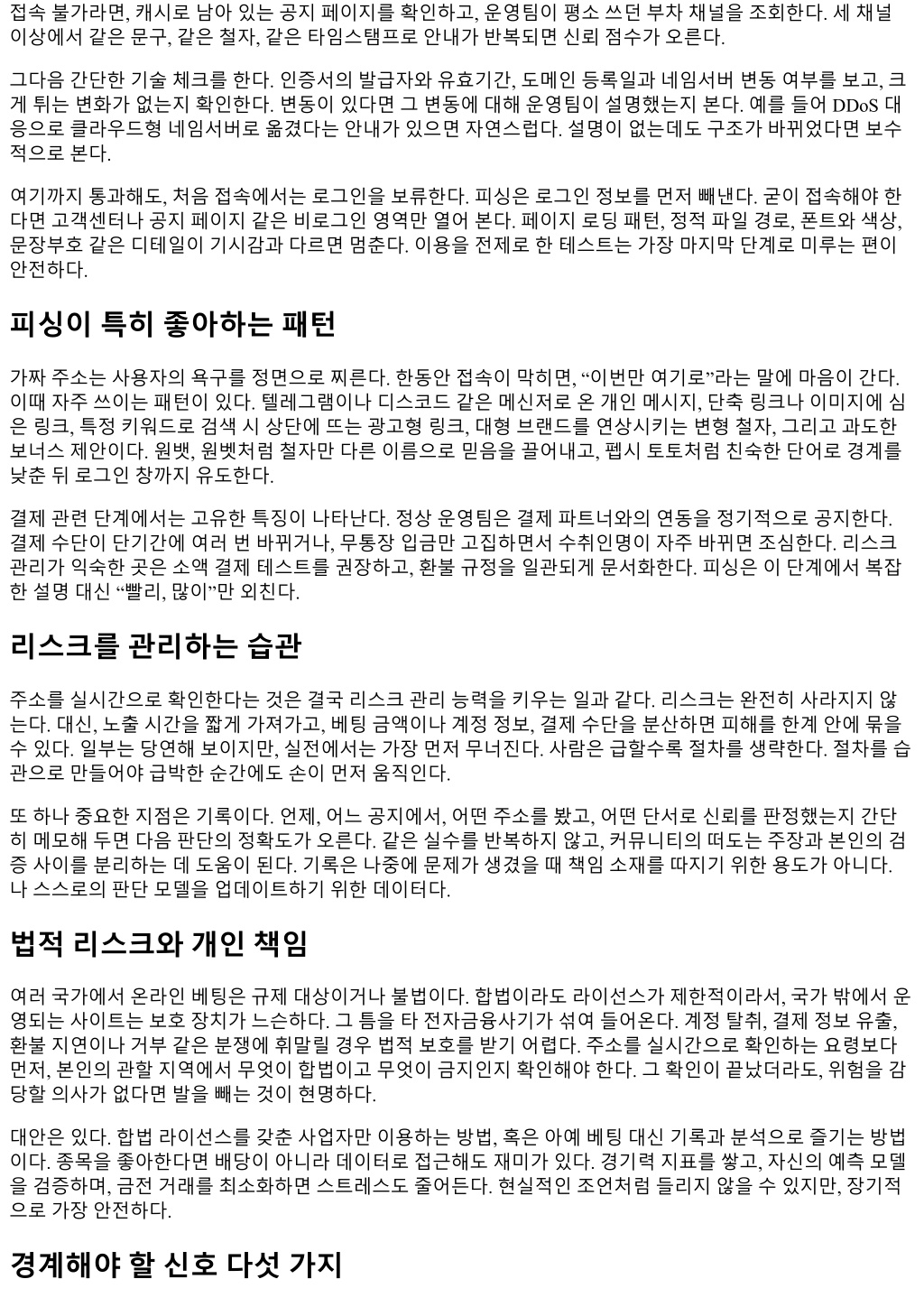 접속불가라면, 캐시로남아있는공지페이지를확인하고, 운영팀이평소쓰던부차채널을조회한다. 세채널 이상에서같은문구, 같은철자, 같은타임스탬프로안내가반복되면신뢰점수가오른다. 그다음간단한기술체크를한다. 인증서의발급자와유효기간, 도메인등록일과네임서버변동여부를보고, 크 게튀는변화가없는지확인한다. 변동이있다면그변동에대해운영팀이설명했는지본다. 예를들어 DDoS 대 응으로클라우드형네임서버로옮겼다는안내가있으면자연스럽다. 설명이없는데도구조가바뀌었다면보수 적으로본다. 여기까지통과해도, 처음접속에서는로그인을보류한다. 피싱은로그인정보를먼저빼낸다. 굳이접속해야한 다면고객센터나공지페이지같은비로그인영역만열어본다. 페이지로딩패턴, 정적파일경로, 폰트와색상, 문장부호같은디테일이기시감과다르면멈춘다. 이용을전제로한테스트는가장마지막단계로미루는편이 안전하다. 피싱이특히좋아하는패턴 가짜주소는사용자의욕구를정면으로찌른다. 한동안접속이막히면, “이번만여기로”라는말에마음이간다. 이때자주쓰이는패턴이있다. 텔레그램이나디스코드같은메신저로온개인메시지, 단축링크나이미지에심 은링크, 특정키워드로검색시상단에뜨는광고형링크, 대형브랜드를연상시키는변형철자, 그리고과도한 보너스제안이다. 원뱃, 원벳처럼철자만다른이름으로믿음을끌어내고, 펩시토토처럼친숙한단어로경계를 낮춘뒤로그인창까지유도한다. 결제관련단계에서는고유한특징이나타난다. 정상운영팀은결제파트너와의연동을정기적으로공지한다. 결제수단이단기간에여러번바뀌거나, 무통장입금만고집하면서수취인명이자주바뀌면조심한다. 리스크 관리가익숙한곳은소액결제테스트를권장하고, 환불규정을일관되게문서화한다. 피싱은이단계에서복잡 한설명대신 “빨리, 많이”만외친다. 리스크를관리하는습관 주소를실시간으로확인한다는것은결국리스크관리능력을키우는일과같다. 리스크는완전히사라지지않 는다. 대신, 노출시간을짧게가져가고, 베팅금액이나계정정보, 결제수단을분산하면피해를한계안에묶을 수있다. 일부는당연해보이지만, 실전에서는가장먼저무너진다. 사람은급할수록절차를생략한다. 절차를습 관으로만들어야급박한순간에도손이먼저움직인다. 또하나중요한지점은기록이다. 언제, 어느공지에서, 어떤주소를봤고, 어떤단서로신뢰를판정했는지간단 히메모해두면다음판단의정확도가오른다. 같은실수를반복하지않고, 커뮤니티의떠도는주장과본인의검 증사이를분리하는데도움이된다. 기록은나중에문제가생겼을때책임소재를따지기위한용도가아니다. 나스스로의판단모델을업데이트하기위한데이터다. 법적리스크와개인책임 여러국가에서온라인베팅은규제대상이거나불법이다. 합법이라도라이선스가제한적이라서, 국가밖에서운 영되는사이트는보호장치가느슨하다. 그틈을타전자금융사기가섞여들어온다. 계정탈취, 결제정보유출, 환불지연이나거부같은분쟁에휘말릴경우법적보호를받기어렵다. 주소를실시간으로확인하는요령보다 먼저, 본인의관할지역에서무엇이합법이고무엇이금지인지확인해야한다. 그확인이끝났더라도, 위험을감 당할의사가없다면발을빼는것이현명하다. 대안은있다. 합법라이선스를갖춘사업자만이용하는방법, 혹은아예베팅대신기록과분석으로즐기는방법 이다. 종목을좋아한다면배당이아니라데이터로접근해도재미가있다. 경기력지표를쌓고, 자신의예측모델 을검증하며, 금전거래를최소화하면스트레스도줄어든다. 현실적인조언처럼들리지않을수있지만, 장기적 으로가장안전하다. 경계해야할신호다섯가지