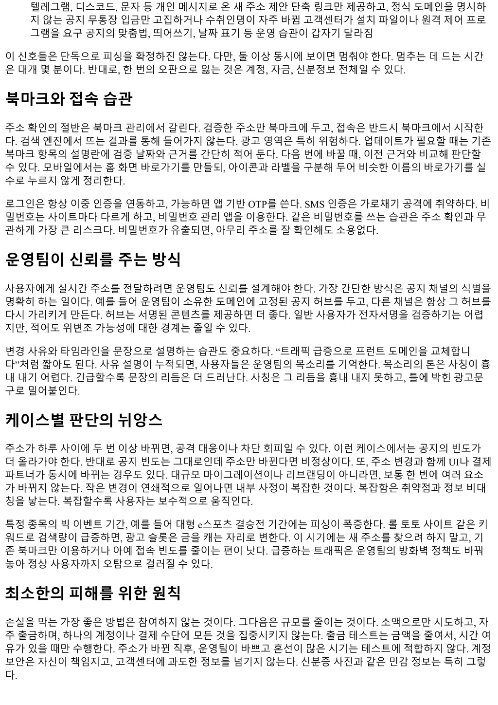 텔레그램, 디스코드, 문자등개인메시지로온새주소제안단축링크만제공하고, 정식도메인을명시하 지않는공지무통장입금만고집하거나수취인명이자주바뀜고객센터가설치파일이나원격제어프로 그램을요구공지의맞춤법, 띄어쓰기, 날짜표기등운영습관이갑자기달라짐 이신호들은단독으로피싱을확정하진않는다. 다만, 둘이상동시에보이면멈춰야한다. 멈추는데드는시간 은대개몇분이다. 반대로, 한번의오판으로잃는것은계정, 자금, 신분정보전체일수있다. 북마크와접속습관 주소확인의절반은북마크관리에서갈린다. 검증한주소만북마크에두고, 접속은반드시북마크에서시작한 다. 검색엔진에서뜨는결과를통해들어가지않는다. 광고영역은특히위험하다. 업데이트가필요할때는기존 북마크항목의설명란에검증날짜와근거를간단히적어둔다. 다음번에바꿀때, 이전근거와비교해판단할 수있다. 모바일에서는홈화면바로가기를만들되, 아이콘과라벨을구분해두어비슷한이름의바로가기를실 수로누르지않게정리한다. 로그인은항상이중인증을연동하고, 가능하면앱기반 OTP를쓴다. SMS 인증은가로채기공격에취약하다. 비 밀번호는사이트마다다르게하고, 비밀번호관리앱을이용한다. 같은비밀번호를쓰는습관은주소확인과무 관하게가장큰리스크다. 비밀번호가유출되면, 아무리주소를잘확인해도소용없다. 운영팀이신뢰를주는방식 사용자에게실시간주소를전달하려면운영팀도신뢰를설계해야한다. 가장간단한방식은공지채널의식별을 명확히하는일이다. 예를들어운영팀이소유한도메인에고정된공지허브를두고, 다른채널은항상그허브를 다시가리키게만든다. 허브는서명된콘텐츠를제공하면더좋다. 일반사용자가전자서명을검증하기는어렵 지만, 적어도위변조가능성에대한경계는줄일수있다. 변경사유와타임라인을문장으로설명하는습관도중요하다. “트래픽급증으로프런트도메인을교체합니 다”처럼짧아도된다. 사유설명이누적되면, 사용자들은운영팀의목소리를기억한다. 목소리의톤은사칭이흉 내내기어렵다. 긴급할수록문장의리듬은더드러난다. 사칭은그리듬을흉내내지못하고, 틀에박힌광고문 구로밀어붙인다. 케이스별판단의뉘앙스 주소가하루사이에두번이상바뀌면, 공격대응이나차단회피일수있다. 이런케이스에서는공지의빈도가 더올라가야한다. 반대로공지빈도는그대로인데주소만바뀐다면비정상이다. 또, 주소변경과함께 UI나결제 파트너가동시에바뀌는경우도있다. 대규모마이그레이션이나리브랜딩이아니라면, 보통한번에여러요소 가바뀌지않는다. 작은변경이연쇄적으로일어나면내부사정이복잡한것이다. 복잡함은취약점과정보비대 칭을낳는다. 복잡할수록사용자는보수적으로움직인다. 특정종목의빅이벤트기간, 예를들어대형 e스포츠결승전기간에는피싱이폭증한다. 롤토토사이트같은키 워드로검색량이급증하면, 광고슬롯은금을캐는자리로변한다. 이시기에는새주소를찾으려하지말고, 기 존북마크만이용하거나아예접속빈도를줄이는편이낫다. 급증하는트래픽은운영팀의방화벽정책도바꿔 놓아정상사용자까지오탐으로걸러질수있다. 최소한의피해를위한원칙 손실을막는가장좋은방법은참여하지않는것이다. 그다음은규모를줄이는것이다. 소액으로만시도하고, 자 주출금하며, 하나의계정이나결제수단에모든것을집중시키지않는다. 출금테스트는금액을줄여서, 시간여 유가있을때만수행한다. 주소가바뀐직후, 운영팀이바쁘고혼선이많은시기는테스트에적합하지않다. 계정 보안은자신이책임지고, 고객센터에과도한정보를넘기지않는다. 신분증사진과같은민감정보는특히그렇 다.