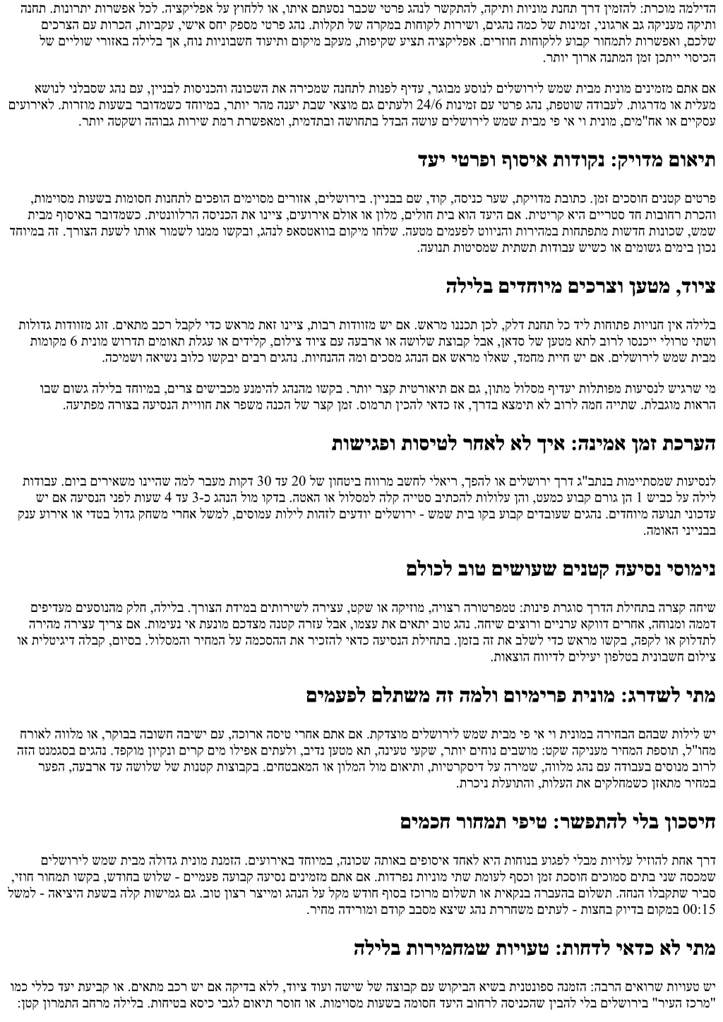 תוצח ירחא הרוק תמאב המ :הריבל שמש תיב ןיב תיליל העיסנ דצמ .תרחא השיגרמ הדוהי ירהב חורה וליפאו ,רתוי םיקיר םישיבכה ,הטקש ריעה :השוחתה תא ריכמ םילשוריל שמש תיב ןיב תולילב עסונש ימ ,ןגוה ריחמ ךירעהל ךיא ,שארמ ןימזהל יתמ ,רשקתהל ימל תעדל ךירצ .תונמוימ וז תויתרגש אל תועשב םילשוריל שמש תיבמ תינומ אוצמל ,ינש ןאכ יתטקיל ,הממיה תועש לכב תוחוקלל תועסה תנמזהו ,םיעוריא יוויל ,תויליל תועיסנ לש םינש ירחא .המיענו החוטב היהת ךרדהש ידכ קודבל המו .הלילב םילשוריל שמש תיבמ תינומ םינימזמשכ תויולעו תוחיטב ,תונימז לע תעדל בושחש המ לכ תא ךומסל רשפא ימ לע :תונטקה תועשב תונימז םירגוס םקלחו ,תמדקומ הנמזה יפל םידבוע םיבר םיגהנ .עובשה עצמא תולילב דחוימבו ,תוצחל םיברקתמש לככ תדרוי תוינטנופסב תוינומה תורידת יווקב .הנתמהה ןמזו ריחמה םג ךכ ךא רתוי ההובג תונימז ,הלוע שוקיבה :הנתשמ הנומתה תבש יאצומו תותבשב .העונת ןיא םא םדקומ םויה תא רבודמ םא חטב ,דעיל תקיודמ העגה תורשפאמ דימת אלו ,תיבל ךומס תורצוע דימת אל ןה לבא ,תויתדוקנ תופולח םיתעל שי הליל תירוביצ הרובחת .עוריאמ הרזח וא ,םידלי ,דויצב תדוקנו העש םימאתמשכ םיכירעמ םיגהנ .םיבצע תכסוח שארמ םילשוריל שמש תיבמ תינומ תנמזה ,תיליל העיסנל ןמזב עיגהל בושח םא ,ינויסינמ דע 15 לש תושימג ןולח גהנל וריאשה ,הליל ןושיאב העיגמש הסיט וא הנותח ,העפוה ירחא העיסנ םיננכתמ םא .םאתהב םיבייחתמו ,הרורב ףוסיא .יופצ אל רוחיא לש הרקמב תויומיענ יא ענומ הז .שארמ הנומתה תא וריבסהו תוקד 20 38 שיבכ קר אל :ןמזהו לולסמה ,ריעה ךותל םיאתמ ךותיחל זאו 1 שיבכל רבחתהל ,38 שיבכ לע תולעל ופידעי םיגהנ ,בורל .םיירשפא םילולסמ המכ שי םילשוריל שמש תיב ןיב םילשוריל תוסומע תוחפה תוסינכה תא ופידעי םירחאו ,םירוזמר ךוסחל ידכ שמש תיב ףקועב ורחביש םיגהנ שי :תופולח תוחתפנ הלילה תועשב ךא תודובע יעטק ,םייתדוקנ םיקקפב יולת ,םירקמה בורב תוקד 55-ל 35 ןיב ענ הלילב העיסנה ןמז .דעיב יולת ,םרכ ןיע ךרד הסינכ וא ןיגב ךרד ומכ .תקיודמ העשל תובייחתה שי םא ןובשחב תחקל יאדכש והשמ הזו ,תיתועמשמ טאהל לוכי םירהב יפרוח לפרע .ריוואה גזמו ,1 שיבכ לע הליל טולשל םכל בושח םא .תמא ןמזב קחרמה דמ יפל םירחא ,םילשוריב דעי רוזא יפל ריחמ ובקני םיגהנהמ קלח .ריחמה לע םג עיפשמ לולסמה שמש תיבמ תומוקמ 6 תינומ וא םילשוריל שמש תיבמ הלודג תינומב רבודמ םא דחוימב ,ןנכותמה לולסמה תא שארמ רשאל גהנהמ ושקב ,תויולעב .רתוי הובג ילועפתה ביכרמה םש ,םילשוריל המלו ,הלילב תולעל רומא הז המכ ומכ תודחוימ תושקב שי ,ןעטמ תופסות שי ,הליל ףירעת שי .הטושפ תחא הבושת תלבקמ אל הלילב םילשוריל שמש תיבמ תינומ הלוע המכ הלאשה דע 180 רוזאב ללכ ךרדב םיענ ליגר ןאדס בכרל תיטרדנטס הליל תעיסנל םיריבס םיחווט .תורבחו םיגהנ ןיב תונוש שיו ,הנתמה וא קונית אסיכ שמש תיבל הסינכהמ ,רקוב תונפל 1:00 העשב עובש עצמאב העיסנ וז םא .בויחה ךרד ןכו ,רוזיפו ףוסיא תודוקנ ,העש :תוביסנה יפל םילקש 260 וא ,קנזמ שוקיבהשכ תבש יאצומב העיסנב רבודמ םא .חווטה לש עצמאה ביבס ורגסי םיבר םיגהנ ,םייניב תוריצע אללו םילשוריל הסינכ רוזאל .טעמ גורחל ףאו ןוילעה הצקל ברקתהל לוכי ריחמה ,שיבכב תודובע םע רעוס הלילב הפ .דקוממ שוקיבו רתוי ההובג לועפת תולעב םיכורכ תומוקמ העבשו ןאווינימ יבכר .רתוי הובג בורל רחמותת םילשוריל שמש תיבמ הלודג תינומ םיבשומ ,תיתרקוי רומיג תמר םע םילשוריל שמש תיבמ יפ יא יא יו תינומב רבודמ םא ,רתוי םיתעלו ,םילקש 380 דע 280 רוזאב עונל לוכי ריחמה בורל היהת םילשוריל שמש תיבמ תומוקמ 6 תינומ ,םיעסונ השיש דע השימח לש הצובק םתא םא .דומצ גהנ תורישו רפושמ םיילגר חוורמ ,םיפלשנ לולסמ תשקב וא ,בר דויצ ףוסיא ,ךרדב הרצק םייניב תריצע :תופסותל בל ומיש .ליגר בכרמ הובג ללוכה ריחמה םא םג ,עסונ רפ רתויב תיאדכה .ריחמה לע עיפשהל לולע ףקוע םייק םא ,גהנה ימ םיימעפ וקדב ,קושל סחיב ידמ ךומנ עמשנ ריחמה םאו .םיחוכיו רצקמ הז .תמדקומ הנמזהב הבותכ ריחמ תעצה ושקב ,הרקמ לכ