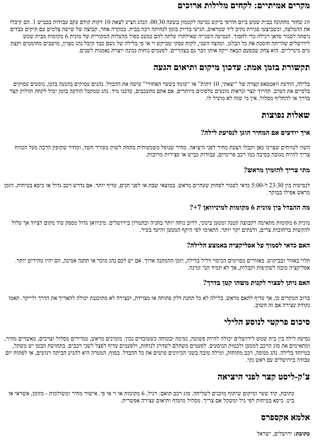 םיכורא תולילמ םיחקל :םייתימא םירקמ ולביק םה .1 שיבכב תודובע בקע םדוק תוקד 10 תאצל עיצה גהנה .00:30 העשב ןומטקל העיסנ שקיב יפרוח םויב שמש תיבב הנותחמ רזחש גוז םידבכ םיקית םע םימלצ השיש לש הצובק ,רחא הרקמב .תיבב הכר התיחנל ןמזב קוידב ועיגה ,סוארטש דיל ביתנ תריגס ועציבשכו ,הצלמהה תא שמש תיבמ תומוקמ 6 תינומ לש תירוקמה תולעהמ לופכ טעמכ םהל התלע ורתליאש היינשה העיסנה .ךוסחל ידכ הליגר ןאדס רוגסל התסינ תצקו םיממוחמ םיבשומ ,ןיוצמ גהנ לביק דבכ םשג לש הלילב יפ יא יו שקיבש יקסע חוקל ,ינשה דצהמו .ןגלבה לכ תא תכסוח התייהש םילשוריל .םינשל תונמאנ תרצוי הנוכנ תוחונ םימעפל .םיירהצב םג רבד ותוא חקיי האבה םעפבש קחצ אוה .םיילרנימ םימ העגה םואיתו םוקימ ןוכדע :תמא ןמזב תרושקת םיקוסע םיעסונ ,ןמזב העגהב םיקוסע םיגהנ .לדבהה תא השוע ”ירוחאה רעשב דמוע“ וא ”תוקד 10 ,יתאצי“ לש הרצק פאסטאוו תעדוה ,הלילב רצק קולדת תחקל לוכי ןמזב העדוה לבקמש גהנ .דימ ונכדע ,םיבכעתמ םתא םא .םירתוימ םינופלט םיענומ תוארנו רצק ךורדת .ברעה תא םייסלב .ול ליעומ אל הזש ימ ןיא .לולסמ ףילחהל וא ךרדב תוצופנ תולאש ?הליל תעיסנל ןגוה ריחמה םא םיעדוי ךיא חווטה לעמ הברה ץפוקש ריחמו ,דשח ררועמ קושל תחתמ תיתועמשמ לפונש ריחמ .האיציה ינפל ריחמ תעצה ולבקו ןאכ וניוצש םיחווטל וושה .תובורמ תוריצע וא שיבכ תודובע ,םוימירפ בכר ומכ הביסב הבוגמ תויהל ךירצ ?שארמ ןימזהל ךירצ יתמ ןמזה ,תוחיטב אסיכ וא לודג בכר שרדנ םא .רתוי ףידע ,םיגח ינפל וא תבש יאצומב .שארמ םייתעש תוחפל רוגסל יאדכ 5:00-ל 23:30 ןיב תועיסנל .רקובב וליפא שארמ ?+7 ןאווינימל תומוקמ 6 תינומ ןיב לדבהה המ לולע ךא דויצל םוקמ דוע קפסמ לודג ןאווינימ .םילשוריב ןורמתבו הינחב רתוי החונ בורל ,ינוניב ןעטמו הנטק הצובקל המיאתמ תומוקמ 6 תינומ .ריעב דעיהו ןעטמה ףקיה יפל ומיאתה .רתוי רקי םיתעלו ,םירצ תובוחרב תושקהל ?הלילה עצמאב היצקילפא לע ךומסל יאדכ םאה .רתוי םיריהמ ויהי םה ,הנימא הנחת וא רכומ גהנ םכל שי םא .ךורא הנתמהה ןמזו ,הלילב לילד יוסיכה םימיוסמ םירוזאב .שוקיבבו רוזאב יולת .הנימז יכה דימת אל ךא ,תולבקו תופיקשל הבוט היצקילפא ?ךרדב ןטק והשמ תונקל רוצעל ןתינ םאה ומאת .רקיילו ךרדה תא ךיראהל הלוכי תננכותמ אל הריצעו ,תדיוצמ וא החותפ קלד תנחת לכ אל הלילב .שארמ םאתל ףידע ךא ,ןכ םירקמה בורב .בושח הז םא הריצע תדוקנ ילילה עסונל יטקרפ םוכיס ,ריחמ םירשאמ ,םיכרצו לולסמ םירידגמ ,שארמ םינימזמ :ןוכנ םידבועשכ החוטבו המיענ ,הטושפ תויהל הלוכי םילשוריל שמש תיב ןיב הליל תעיסנ ,לקשמ שי ןטבה תשוחתב .םיבכר ינשל לצפל ףידע םימעפלו ,תוחונל גרדשל םלתשמ םימעפל .םיעסונה תומכלו ןעטמל בכרה גוס תא םימיאתמו םוי חותפל וא ,םיעוגר התיבה עיגהל איה הרטמה ,ףוסב .לדבהה לכ תא םישוע םינוויכה ינשב הבוט הלימו ,קזחותמ בכר ,הסונמ גהנ .הלילב דחוימב .יקנ שאר םע םילשוריב הדובע האיציה ינפל רצק טסיל-ק'צ וא יארשא ,ןמוזמ - תומלושמו ריחמ רושיא .יפ יא יו וא תומוקמ 6 ,ליגר :םאות בכר גוס .החילשל םינכומ ףותיש םוקימו רעש דוק ,תבותכ .תירשפא הריצע םואיתו ףדעומ לולסמ .ךירצ םא לקשמו ליג יפל תוחיטב אסיכ .טיב סרפסקא אמלא לארשי ,םילשורי :תבותכ