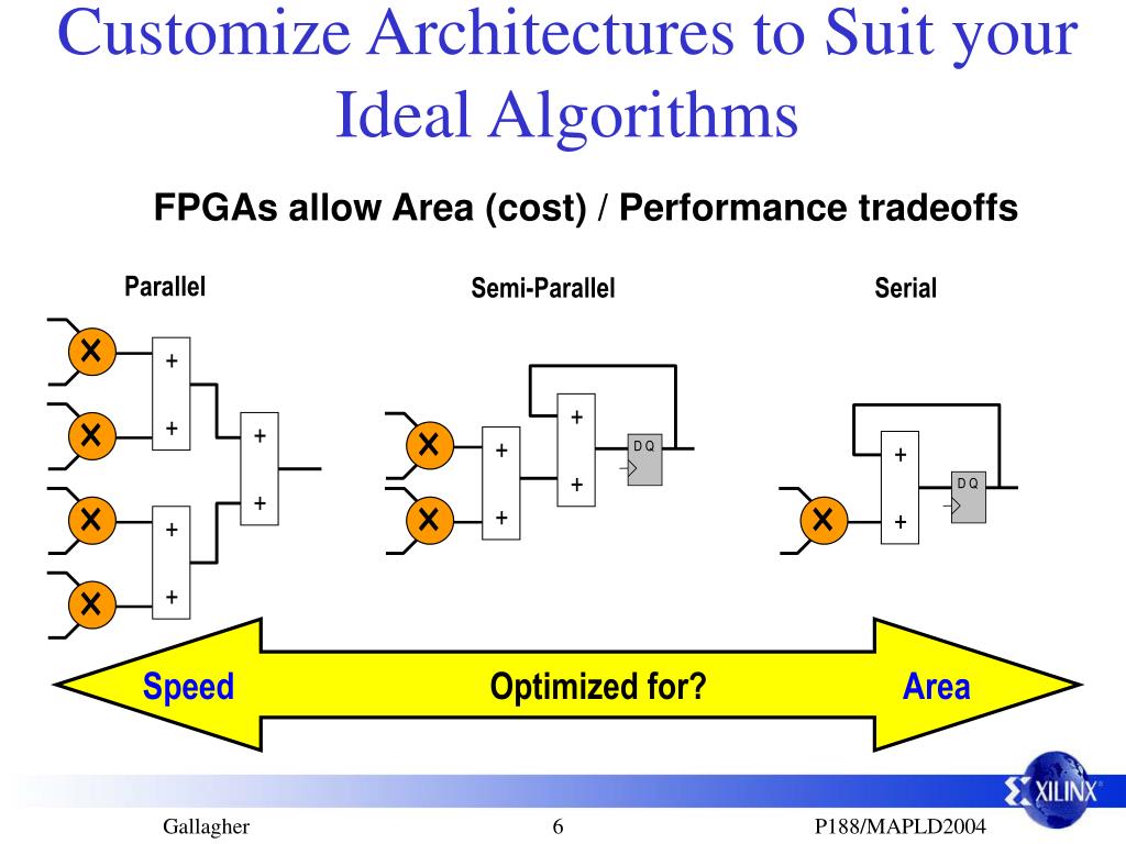 × × × × × × × D Q + + + + + + + + + + + + Customize Architectures to Suit your Ideal Algorithms FPGAs allow Area (cost) / Performance tradeoffs Parallel Semi-Parallel Serial D Q Speed Optimized for? Area